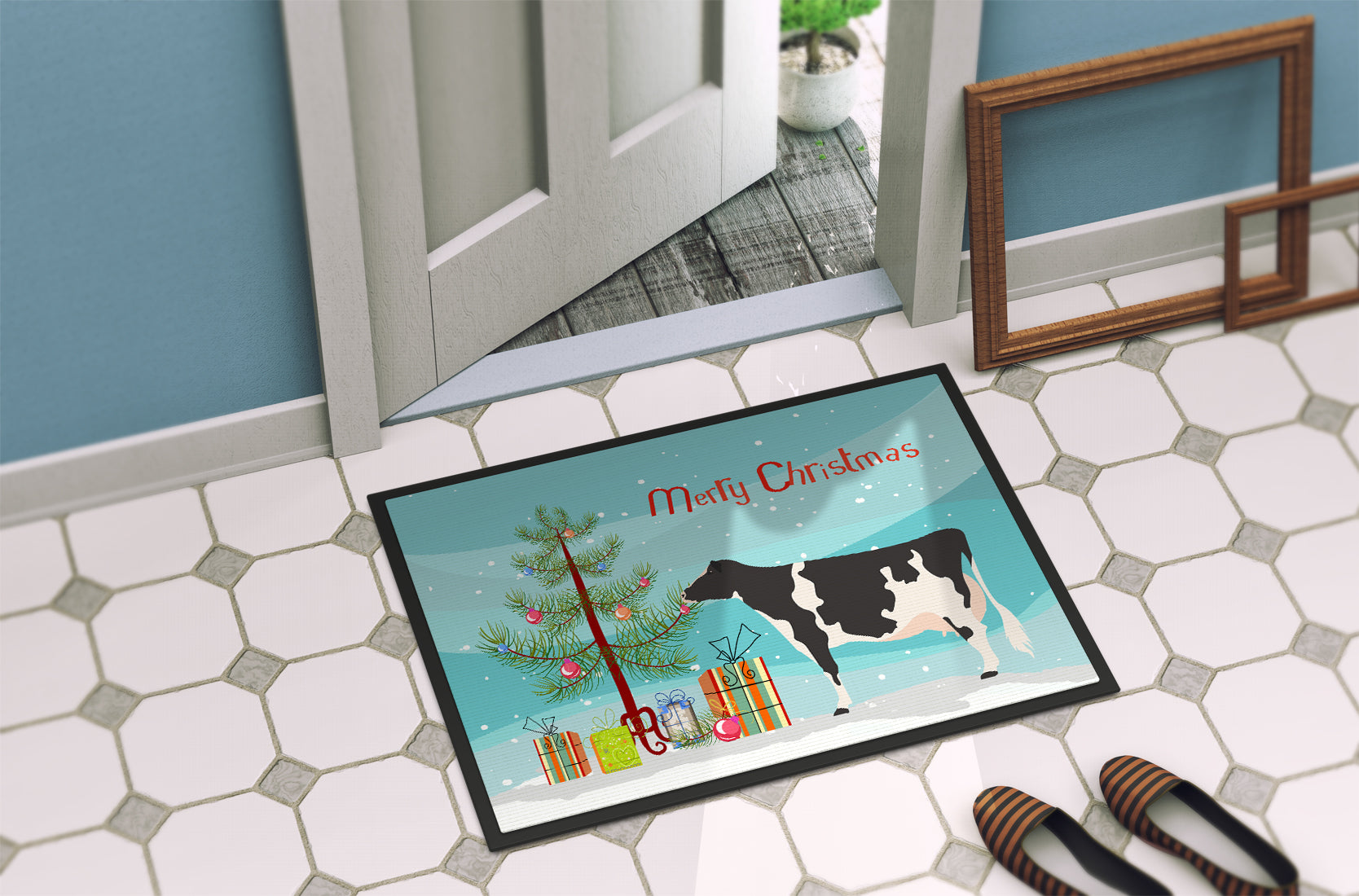 Decorate your space with our Christmas Holstein Cow artwork on a Doormat. Welcome your guests in style with our Artwork Door Mat, designed to withstand almost any weather condition. This mat, measuring approximately 24 by 36 inches, is held together by durable black binding tape. Its top layer, composed of polyester felt, is dyed with the eye-catching image you see on the mat. A few layers below provide the mat with stability, while its rubber bottom is stamped to help prevent slipping and ensures safety. Our mat works wonderfully as both an indoor or outdoor door mat. For cleaning, simply hose it off with water or use a power washer - no need for any cleaner that produces suds. Avoid scrubbing with a brush, instead, opt for the vacuum on floor setting. Designed manufactured and printed in the USA, this mat is a perfect addition to your porch, outdoor kitchen, entryway, or any indoor space. Its unique design makes it a charming decorative rug that greets your guests and adds a stylish touch to your home decor.