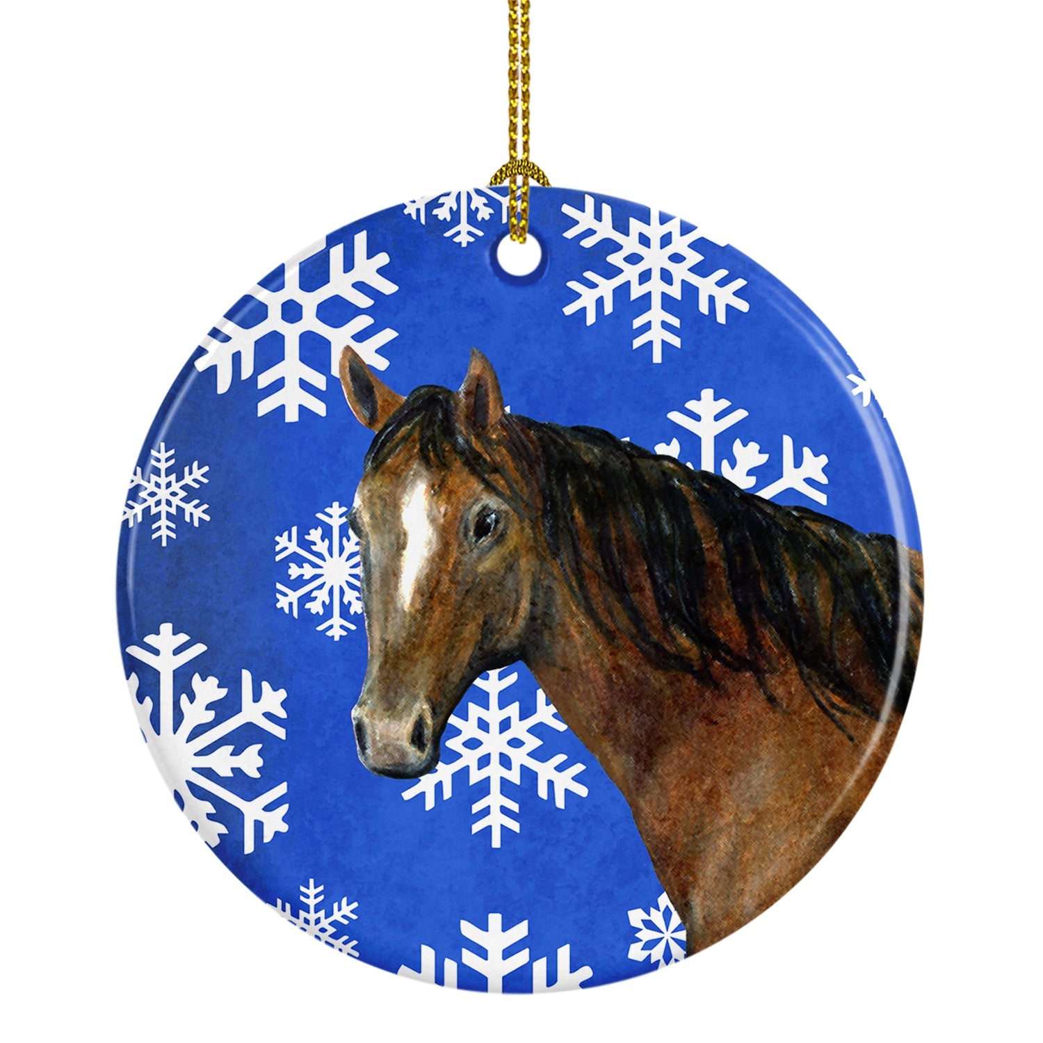 Decorate your space with our Christmas Horse artwork on a Ornament. Bring a bit of Winter into your home with a Winter Ornament. Add a touch of personalized charm to your Christmas tree this holiday season with our Ceramic Ornament. Measuring 2.8125 inches in diameter, this round porcelain ornament beautifully reflects your festive lights, enhancing your holiday decor. The gloss surface sets off the vibrant, full-color artwork contributed by one of our talented artists, bringing a pop of color and joy to your tree. This Ceramic Ornament doesn't stop at being merely decorative. The white back is designed for personalization. Write a heartfelt message, mark a special year, or inscribe a date with a paint pen or a permanent marker to create a treasured memento. Please ensure you allow any personalization to dry thoroughly before handling to maintain the pristine finish. Included with the ornament is a delicate gold cord for easy hanging. Made in the USA, this Ceramic Ornament makes an exceptional gift for a pet sitter, teacher, family member, or anyone you wish to share a little Christmas magic with. With its blend of style, charm, and personal touch, it's a meaningful addition to any Christmas tree.