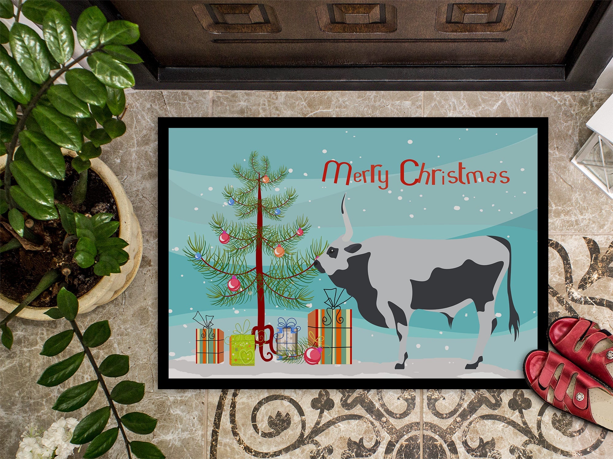 Decorate your space with our Christmas Hungarian Grey Steppe Cow artwork on a Doormat. Welcome your guests in style with our Artwork Door Mat, designed to withstand almost any weather condition. This mat, measuring approximately 18 by 27 inches, is held together by durable black binding tape. Its top layer, composed of polyester felt, is dyed with the eye-catching image you see on the mat. A few layers below provide the mat with stability, while its rubber bottom is stamped to help prevent slipping and ensures safety. Our mat works wonderfully as both an indoor or outdoor door mat. For cleaning, simply hose it off with water or use a power washer - no need for any cleaner that produces suds. Avoid scrubbing with a brush, instead, opt for the vacuum on floor setting. Designed manufactured and printed in the USA, this mat is a perfect addition to your porch, outdoor kitchen, entryway, or any indoor space. Its unique design makes it a charming decorative rug that greets your guests and adds a stylish touch to your home decor.