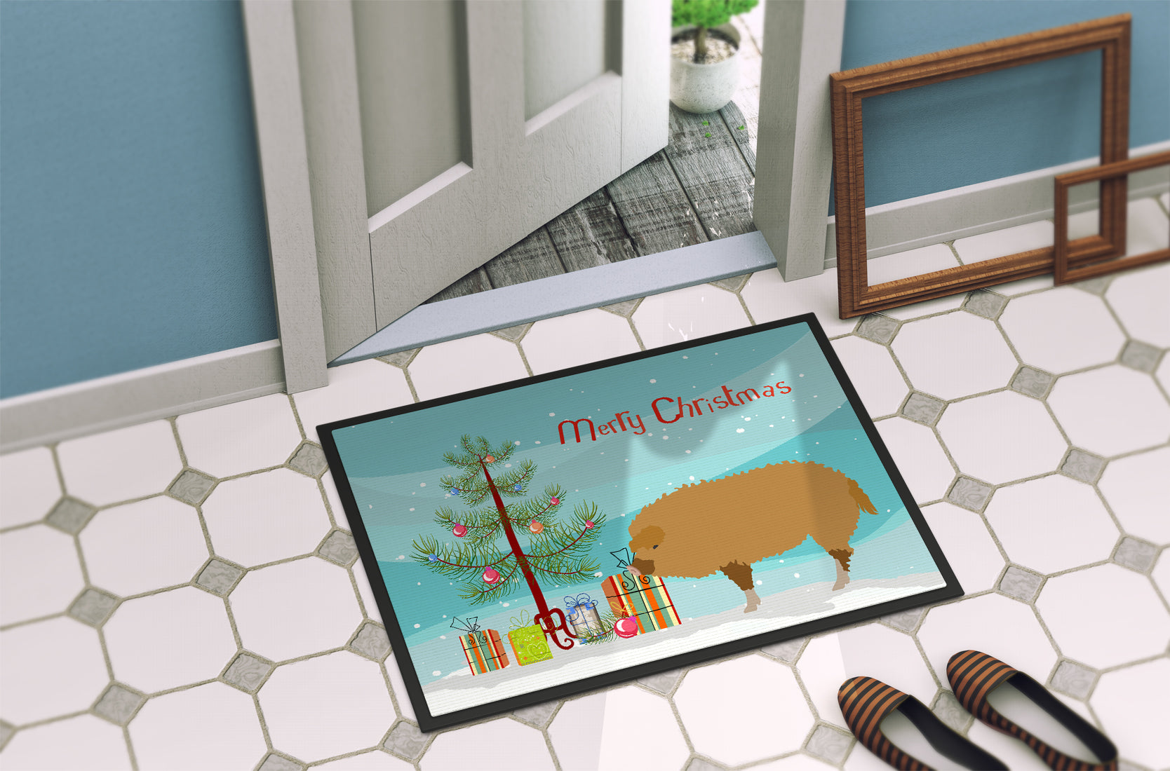 Decorate your space with our Christmas Hungarian Mangalica Pig artwork on a Doormat. Welcome your guests in style with our Artwork Door Mat, designed to withstand almost any weather condition. This mat, measuring approximately 24 by 36 inches, is held together by durable black binding tape. Its top layer, composed of polyester felt, is dyed with the eye-catching image you see on the mat. A few layers below provide the mat with stability, while its rubber bottom is stamped to help prevent slipping and ensures safety. Our mat works wonderfully as both an indoor or outdoor door mat. For cleaning, simply hose it off with water or use a power washer - no need for any cleaner that produces suds. Avoid scrubbing with a brush, instead, opt for the vacuum on floor setting. Designed manufactured and printed in the USA, this mat is a perfect addition to your porch, outdoor kitchen, entryway, or any indoor space. Its unique design makes it a charming decorative rug that greets your guests and adds a stylish touch to your home decor.