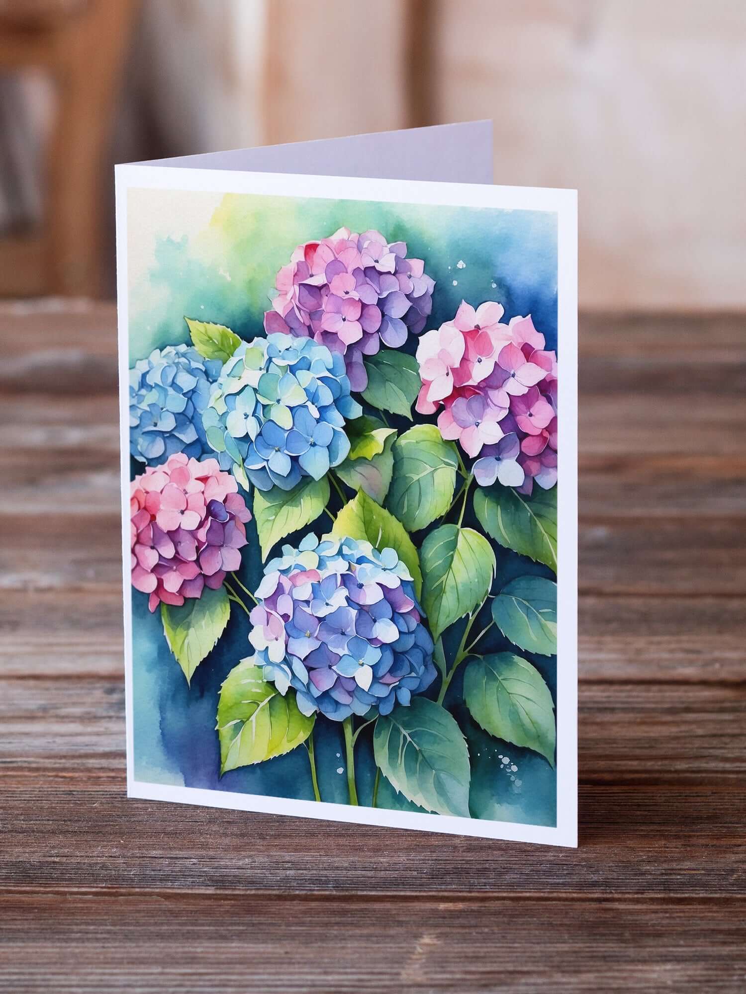 Greeting Cards Pack of 8 featuring breed specific Hydrangeas artwork. Celebrate special moments with Caroline's Treasures Printed Greeting Card Pack. This pack includes eight beautifully folded 5x7 cards, accompanied by eight matching white envelopes. With blank interiors, these cards provide ample space for your personalized messages and heartfelt holiday greetings. Each card features captivating full-color artwork, meticulously printed in our facility on high-quality 80 lb cover stock or 216 GSM. The super smooth finish of the white cards enhances the visual impact of the artwork, creating a truly stunning presentation. Designed by our talented in-house artists or licensed artists, the artwork on these cards showcases their creativity and attention to detail. From vibrant illustrations to captivating designs, each card tells its own unique story. Whether it's for birthdays, anniversaries, holidays, or any special occasion, Caroline's Treasures Greeting Card Pack is the perfect way to convey your heartfelt sentiments. Share joy, love, and warm wishes with these exquisite cards and make every moment unforgettable.