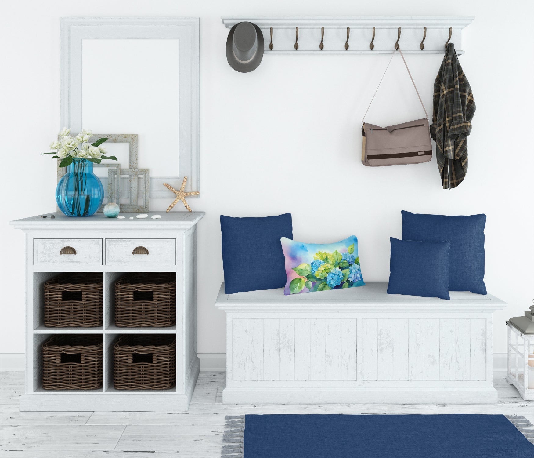 Decorate your space with our Hydrangeas artwork on a Pillow. Embrace the fusion of comfort and style with Caroline's Treasures Fabric Decorative Pillow. This 12x16 inch outdoor pillow is designed to complement your patio furniture, adding a splash of color and artistry to your outdoor setting. Constructed with a 100% Polyester Fabric pillow sham filled with a plush pillow form, this cushion is as comfortable as it is durable. Our outdoor pillow utilizes a novel fabric, meticulously woven for enhanced water resistance. This soft canvas material is equally suited for your indoor couch as well as outdoor settings such as the patio, porch, or veranda. To ensure enduring vibrance, we employ colorfast dyes resistant to fading even when subjected to weather elements. The making of this pillow involves the delicate sewing together of three fabric pieces to create a sham, into which a polyester insert is carefully placed. The result is an overstuffed pillow that tenaciously holds its shape. With both the sham and the pillow insert crafted in the United States, these handmade pillows are a testament to superior local craftsmanship. Note that as these pillows are handmade, sizes may slightly vary, enhancing their unique appeal. Enjoy comfort in style with Caroline's Treasures Fabric Decorative Pillow.
