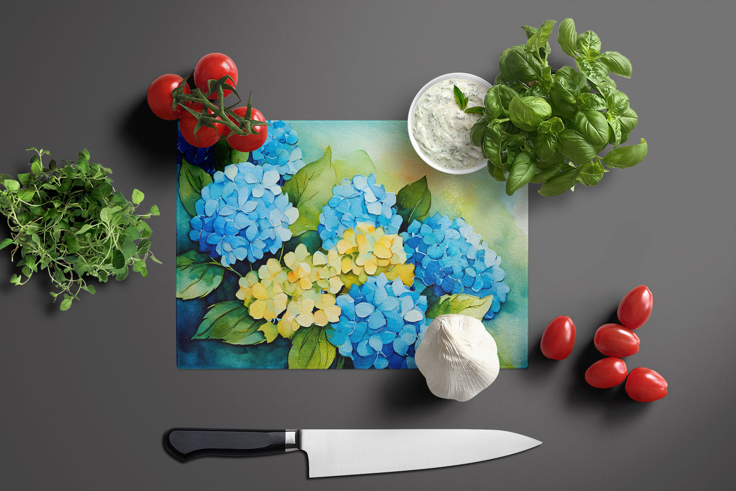 Hydrangeas in Watercolor Glass Cutting Boards – Durable, Decorative Kitchen Art Large