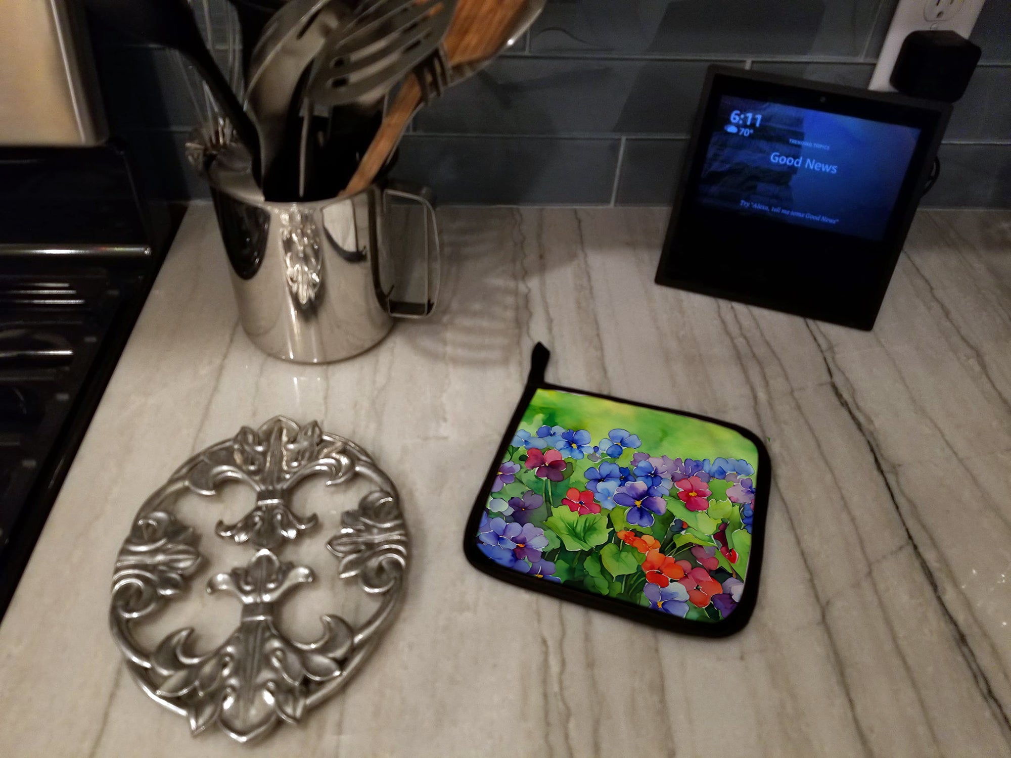 Pair of Pot Holders featuring breed specific Illinois Violet artwork. A Pair of Pot Holders to match your kitchen decor. Made in the USA these are thick and functional. Full color artwork decorates the front polyester fabric of the hot pad and accented by a black trim. Use these at as a trivet for your Thanksgiving or Christmas tablescape. Filled with insulated fabric and quilted for durability. These colorful pot holders will make a great gift for your favorite home cook or executive chef. Each pot holder measures approximately 7 1/2 inches by 7 1/2 inches. A hanging tab is included.