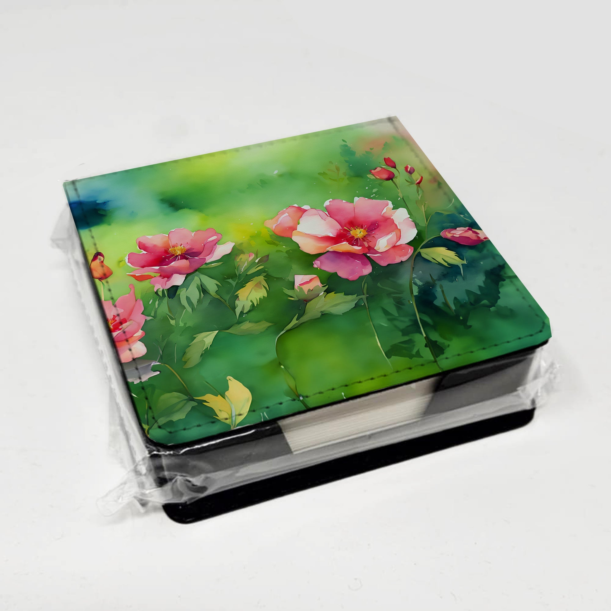 PU Leather Note Paper Holder featuring breed specific Iowa Wild Prairie Roses artwork. Elevate your workspace with this PU Leather Note Paper Holder, crafted to resemble luxurious leather without the use of animal products. Made from durable synthetic PU leather, it offers both a premium look and eco-friendly appeal. This note holder, compactly sized at 4.25 x 4.25 x 1.25 inches, includes about 160 sheets of 3.75 x 3.75-inch note paper—ideal for quick notes and reminders. An exclusive artist-designed cover makes each holder uniquely vibrant, adding a splash of color and personality to any desk or office. The discrete design keeps note paper hidden, maintaining a neat and organized workspace. Perfect as a gift or for personal use, this stylish holder is refillable with standard paper, ensuring long-lasting utility. A must-have for anyone seeking a sophisticated, artful touch to their workspace while supporting animal-friendly products. Add style, organization, and creativity to your everyday routine with this elegant note paper holder.