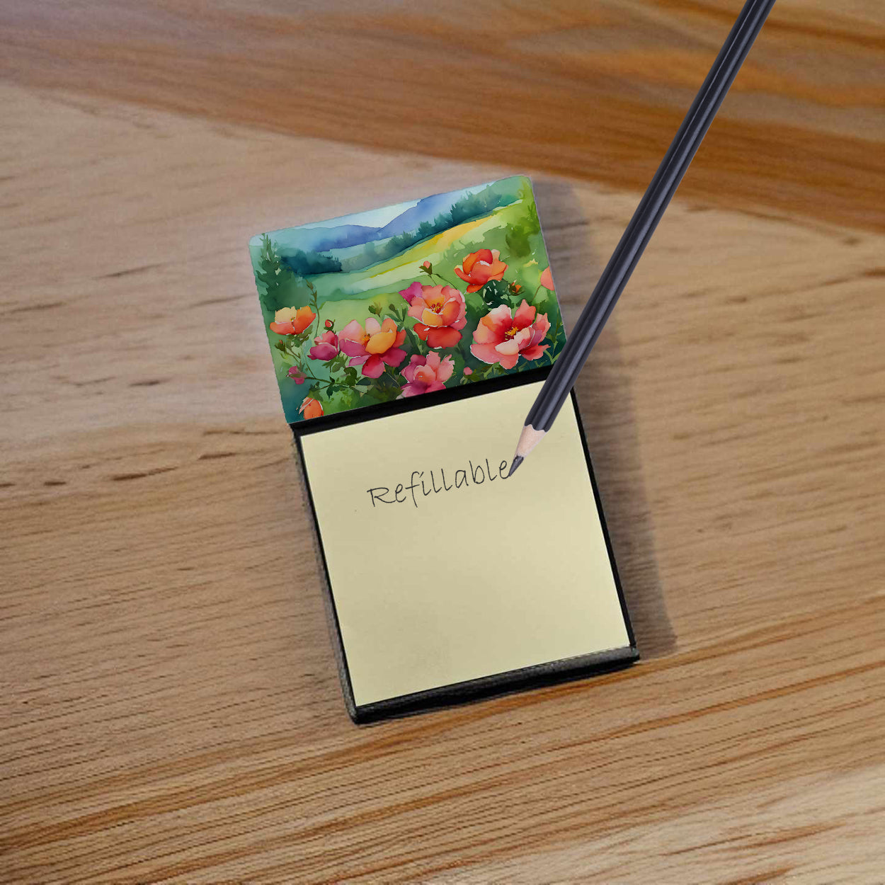 Decorate your space with our Iowa Wild Prairie Roses artwork on a Sticky Note Holder. Add a touch of creativity and flair to your desk with the Decorative Sticky Note Holder from Caroline's Treasures. This uniquely designed sticky note dispenser will not only keep your notes in one place but also add an artistic element to your workspace. The top of the holder features beautiful artwork that is sure to catch the eye. Crafted for convenience, this sticky note holder comes with a small pad of 3-inch x 3-inch sticky notes at the bottom. The holder is designed for easy refilling; simply remove the last sheet of a new sticky note pad and stick it onto the board. This feature ensures you will always have sticky notes at your disposal. This Sticky Note Holder makes a perfect gift. Be it for your colleagues at work, your Facebook friends, or even your dog groomer or hairdresser, this versatile product fits the bill. You can use it for making grocery lists, leaving notes for loved ones, or for jotting down important reminders. The bottom board is rigid and can be magnetized by adding a business card size magnet to the back (sold separately). This makes it even more versatile, allowing you to place it on a refrigerator or any other magnetic surface. With this Sticky Note Holder, you're not only organizing your notes, but also personalizing your space.