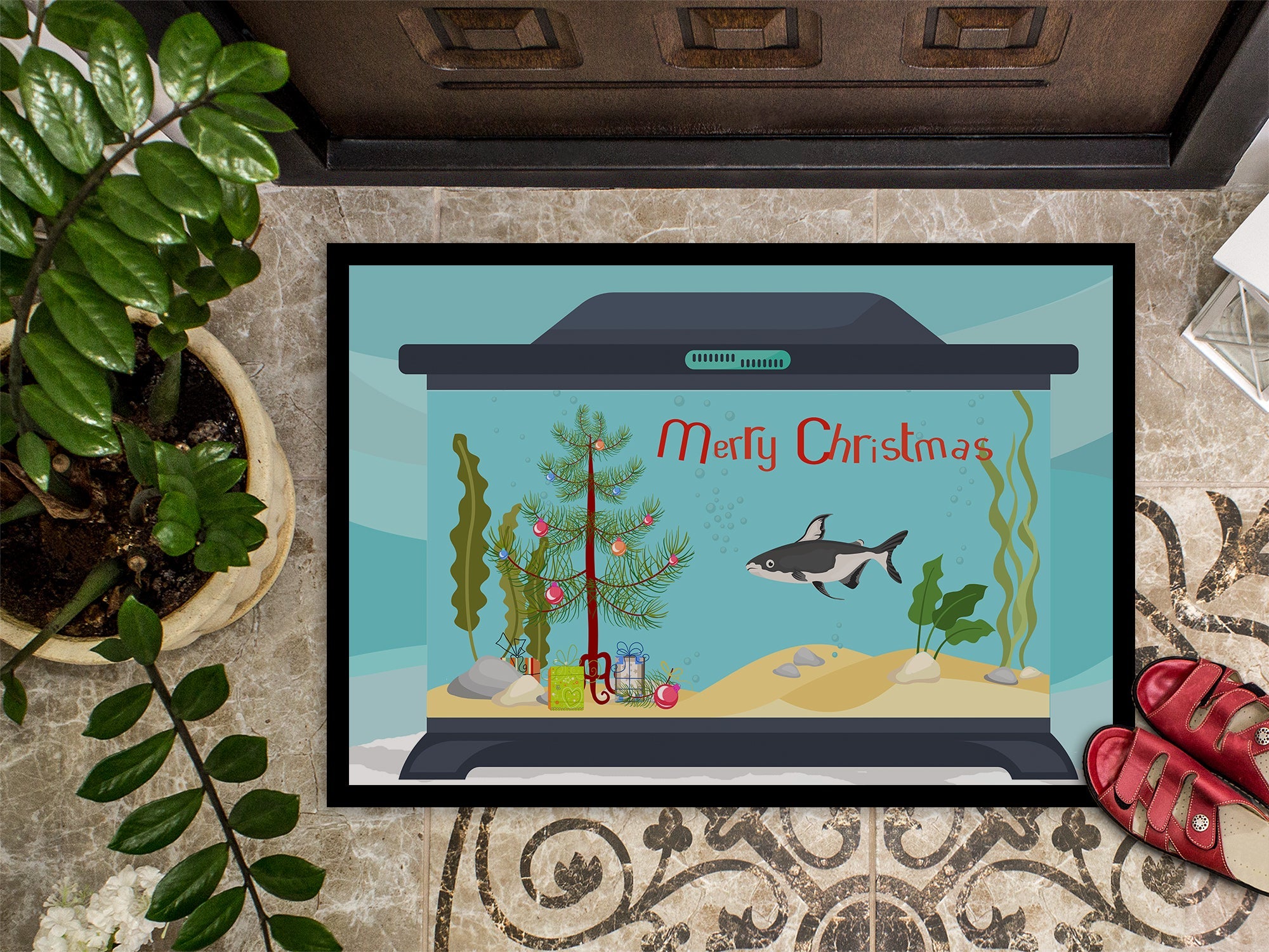 Decorate your space with our Christmas Iridescent Shark artwork on a Doormat. Welcome your guests in style with our Artwork Door Mat, designed to withstand almost any weather condition. This mat, measuring approximately 18 by 27 inches, is held together by durable black binding tape. Its top layer, composed of polyester felt, is dyed with the eye-catching image you see on the mat. A few layers below provide the mat with stability, while its rubber bottom is stamped to help prevent slipping and ensures safety. Our mat works wonderfully as both an indoor or outdoor door mat. For cleaning, simply hose it off with water or use a power washer - no need for any cleaner that produces suds. Avoid scrubbing with a brush, instead, opt for the vacuum on floor setting. Designed manufactured and printed in the USA, this mat is a perfect addition to your porch, outdoor kitchen, entryway, or any indoor space. Its unique design makes it a charming decorative rug that greets your guests and adds a stylish touch to your home decor.