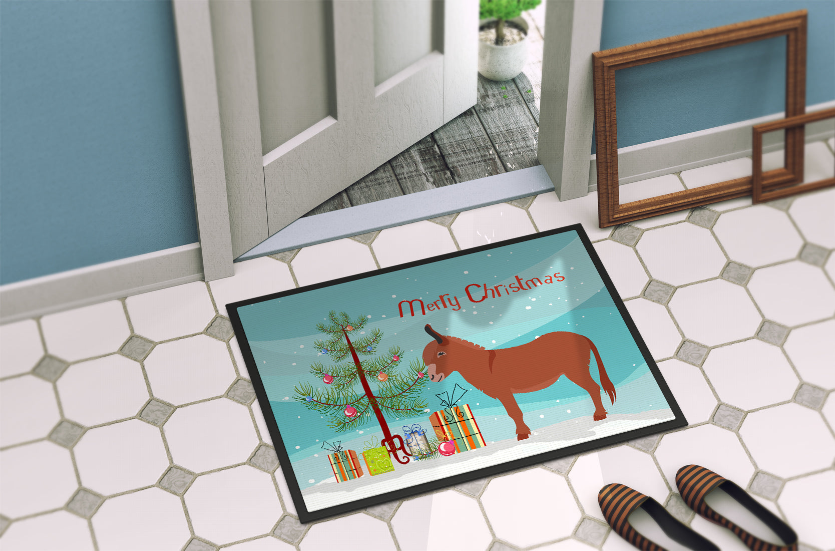 Decorate your space with our Christmas Irish Donkey artwork on a Doormat. Welcome your guests in style with our Artwork Door Mat, designed to withstand almost any weather condition. This mat, measuring approximately 24 by 36 inches, is held together by durable black binding tape. Its top layer, composed of polyester felt, is dyed with the eye-catching image you see on the mat. A few layers below provide the mat with stability, while its rubber bottom is stamped to help prevent slipping and ensures safety. Our mat works wonderfully as both an indoor or outdoor door mat. For cleaning, simply hose it off with water or use a power washer - no need for any cleaner that produces suds. Avoid scrubbing with a brush, instead, opt for the vacuum on floor setting. Designed manufactured and printed in the USA, this mat is a perfect addition to your porch, outdoor kitchen, entryway, or any indoor space. Its unique design makes it a charming decorative rug that greets your guests and adds a stylish touch to your home decor.
