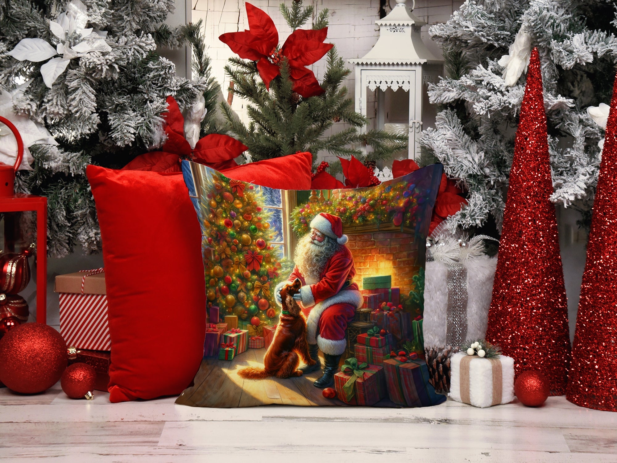 Throw Pillow featuring breed specific Irish Setter artwork. Celebrate Christmas with this Christmas Pillow. Add a touch of vibrancy and comfort to your outdoor seating with Caroline's Treasures Fabric Decorative Pillow. Measuring approximately 14 inches by 14 inches, this outdoor pillow is crafted to elevate the appeal of your patio furniture, infusing it with vivid color and artistic flair. The pillow includes a 100% Polyester Fabric sham filled with a quality pillow form to provide superior comfort. Innovatively made from our brand new material, specifically woven for its water resistance, this pillow is designed for durability. The soft canvas fabric offers versatility in use, fit for your indoor couch or your outdoor patio, porch, or veranda. The fabric is dyed with colorfast dyes built for resilience against weather conditions, ensuring the pillow retains its beauty over time. Constructed by sewing three fabric pieces to create a sham, the polyester insert is then nestled inside to form the pillow, resulting in an overstuffed pillow that maintains its shape. Both the sham and the pillow insert are proudly made in the United States. As the pillows are handcrafted, there may be minor variations in size, further enhancing their unique charm. Experience comfort in style with Caroline's Treasures Fabric Decorative Pillow.