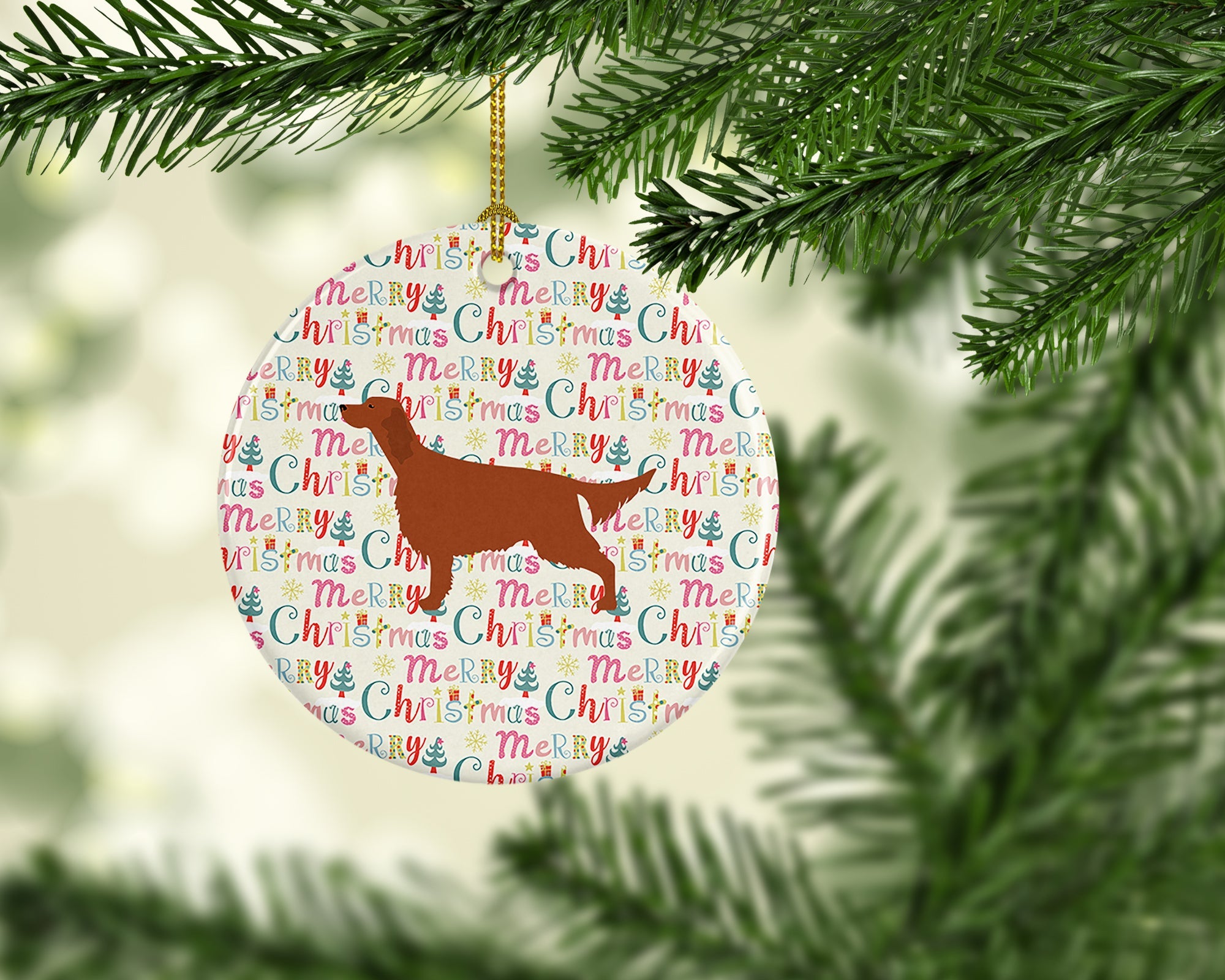 Decorate your space with our Irish Setter artwork on a Ornament. Add a touch of personalized charm to your Christmas tree this holiday season with our Ceramic Ornament. Measuring 2.8125 inches in diameter, this round porcelain ornament beautifully reflects your festive lights, enhancing your holiday decor. The gloss surface sets off the vibrant, full-color artwork contributed by one of our talented artists, bringing a pop of color and joy to your tree. This Ceramic Ornament doesn't stop at being merely decorative. The white back is designed for personalization. Write a heartfelt message, mark a special year, or inscribe a date with a paint pen or a permanent marker to create a treasured memento. Please ensure you allow any personalization to dry thoroughly before handling to maintain the pristine finish. Included with the ornament is a delicate gold cord for easy hanging. Made in the USA, this Ceramic Ornament makes an exceptional gift for a pet sitter, teacher, family member, or anyone you wish to share a little Christmas magic with. With its blend of style, charm, and personal touch, it's a meaningful addition to any Christmas tree.