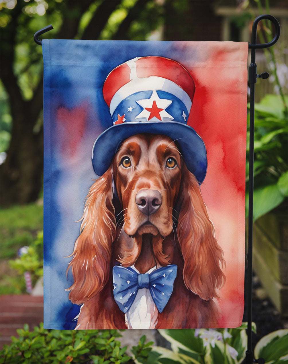 Decorate your space with our Irish Setter artwork on a Garden Flag. Enhance the beauty of your garden, patio, or yard with Caroline's Treasures Decorative Garden Flag, proudly made in the USA. Crafted from two pieces of thick, double-sided polyester fabric, this 2-ply garden flag is designed to withstand various weather conditions, making it water-resistant and weatherproof. Featuring correctly readable words on both sides, this garden flag offers a delightful visual experience from any angle. With its heavier weight, it stands out among other garden flags, ensuring stability and durability even in wind, rain, and snow. Measuring approximately 11 1/4 inches by 15 1/2 inches, this flag allows you to personalize your outdoor decor. It comes with a 1 1/2-inch sleeve sewn in, allowing easy attachment to any standard garden flag stand or garden size porch hanger (sold separately). Make a statement in your outdoor space with Caroline's Treasures Decorative Garden Flag, a vibrant and high-quality flag that adds color and personality to your surroundings. Proudly made in the USA, it's a symbol of quality craftsmanship and attention to detail.