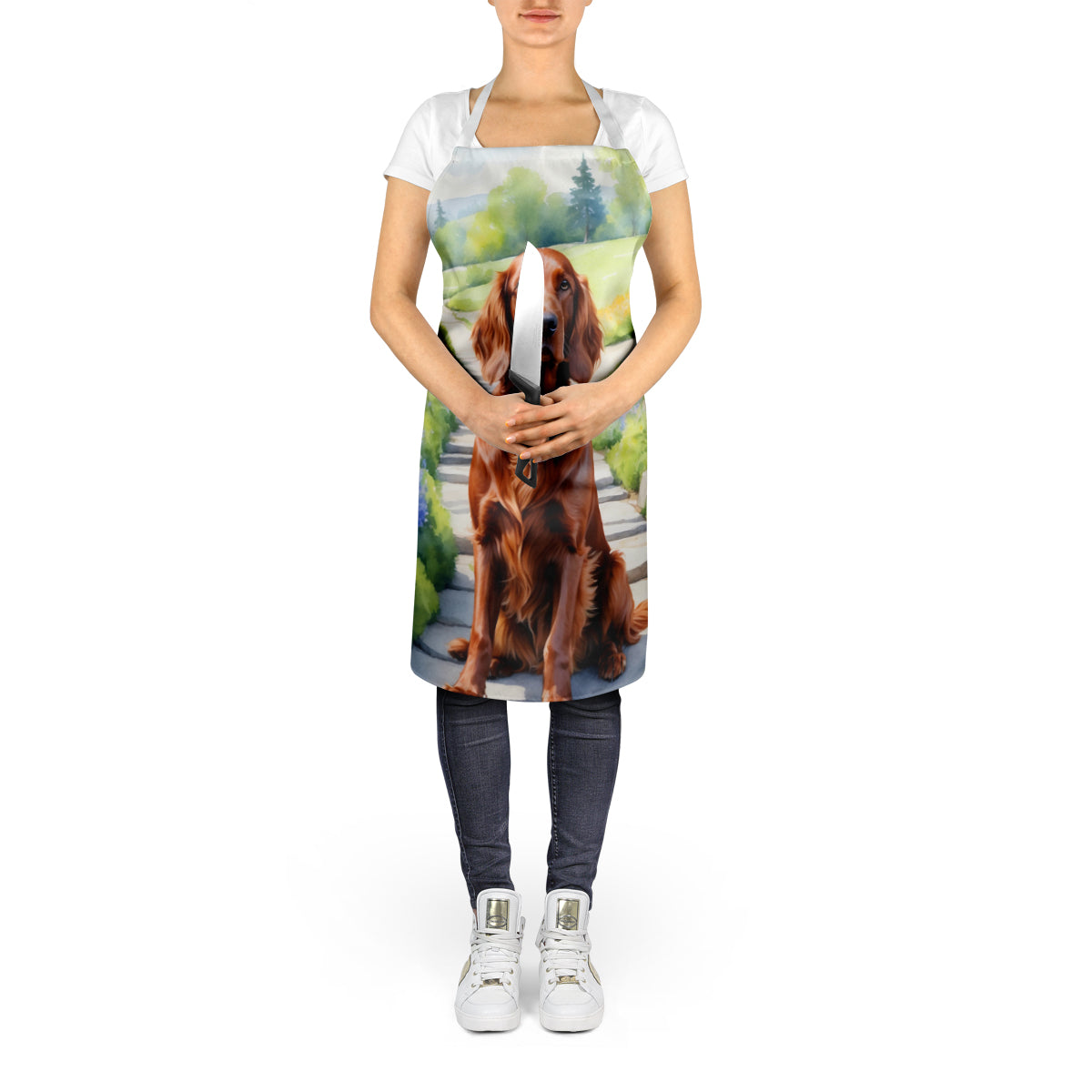 Decorate your space with our Irish Setter artwork on a Apron. Bring a bit of Spring into your home with a Spring Apron. Elevate your cooking, baking, and grilling experiences with our versatile Kitchen or BBQ Apron. This Bib Style apron isn't just limited to culinary activities - it also serves as an excellent baking apron, artist apron, server apron, gardening apron, or even a dog grooming apron. The apron showcases vibrant full-color artwork contributed by one of our talented artists, bringing a dash of style to your daily tasks. With dimensions of approximately 27"W x 30"H, it provides ample coverage to protect your clothing from spills and splashes. Our apron is meticulously crafted from 100% Ultra Spun Polyester, known for its durability and lightweight nature. The apron comes with white tie straps, ensuring a comfortable and adjustable fit for all. It's a perfect choice for kitchen apron enthusiasts, whether you are a woman or a man. Designed for easy maintenance, this apron is fully machine washable. The quick-drying polyester material actively reduces staining, keeping your apron looking fresh and new for longer. Our beautifully designed apron isn't just a functional kitchen accessory - it's a fashion statement in the culinary world!