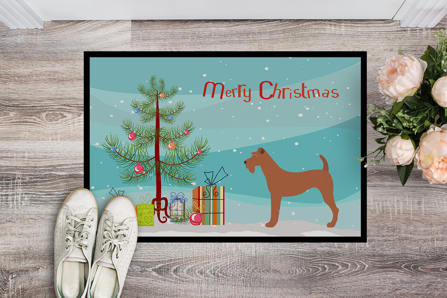 Decorate your space with our Christmas Irish Terrier artwork on a Doormat. Welcome your guests in style with our Artwork Door Mat, designed to withstand almost any weather condition. This mat, measuring approximately 24 by 36 inches, is held together by durable black binding tape. Its top layer, composed of polyester felt, is dyed with the eye-catching image you see on the mat. A few layers below provide the mat with stability, while its rubber bottom is stamped to help prevent slipping and ensures safety. Our mat works wonderfully as both an indoor or outdoor door mat. For cleaning, simply hose it off with water or use a power washer - no need for any cleaner that produces suds. Avoid scrubbing with a brush, instead, opt for the vacuum on floor setting. Designed manufactured and printed in the USA, this mat is a perfect addition to your porch, outdoor kitchen, entryway, or any indoor space. Its unique design makes it a charming decorative rug that greets your guests and adds a stylish touch to your home decor.