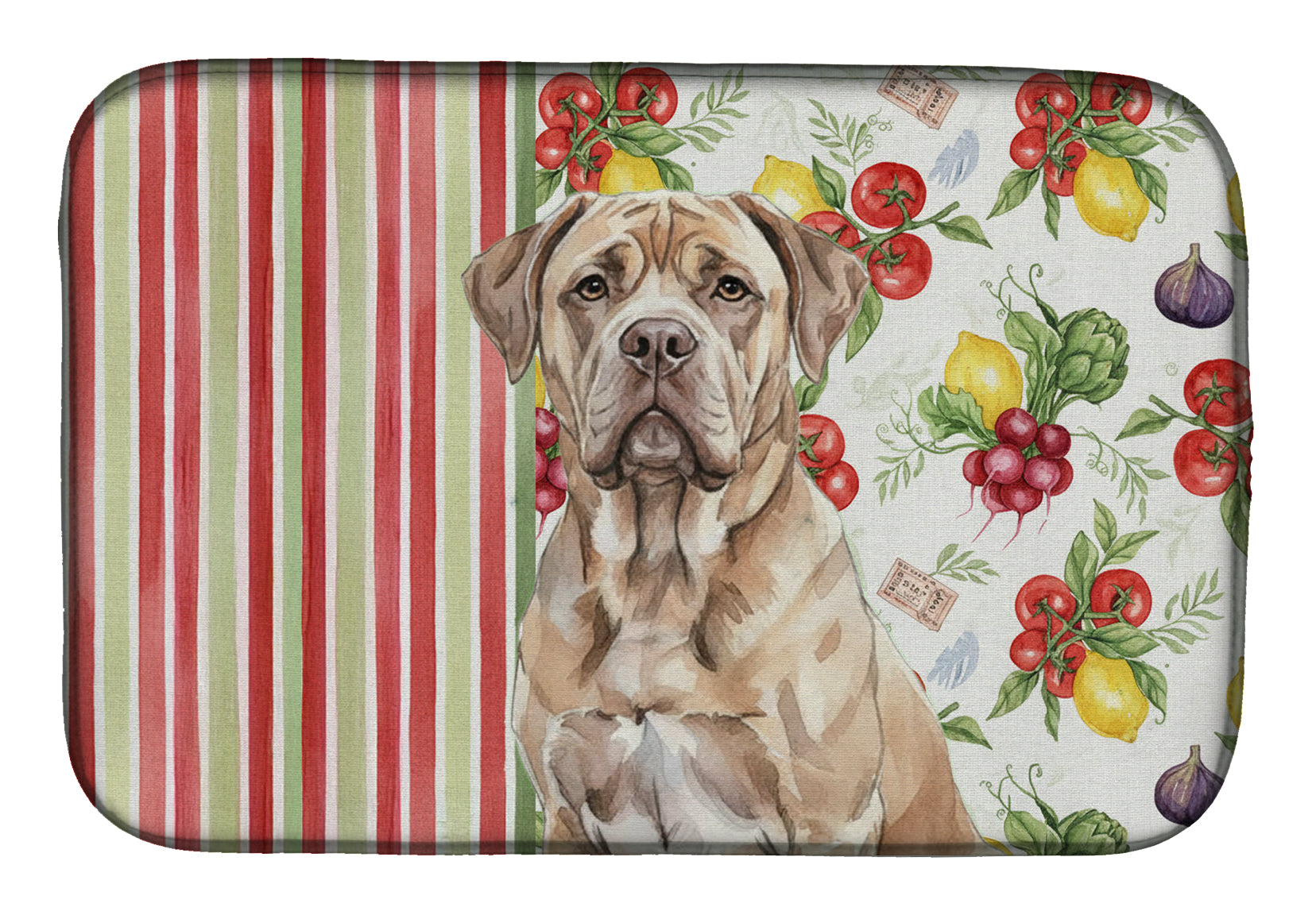 Shown here is the Isabella Dogue de Bordeaux Vegetables Dish Drying Mat from Caroline's Treasures featuring artwork of a Dogue de Bordeaux in a Everyday design. The detailed illustration and vibrant colors make it a standout accent that celebrates both seasonal style and love for the subject. This image features a vibrant watercolor vegetable pattern with tomatoes, lemons, artichokes, figs, radishes, and leafy greens arranged in a repeating design, paired with classic red and green stripes. The bright, garden-fresh palette creates a cheerful, farmhouse-inspired look that feels lively, welcoming, and perfect for kitchen décor. Everyday décor celebrates personal style and the small moments that make a house feel like home. Thoughtful designs add warmth and personality that can be enjoyed year-round. Say goodbye to messy countertops and soggy dish towels with our innovative dish drying mat. Our high-quality dish drying pad is designed to keep your countertops dry while offering a stylish and efficient solution. Whether you're air drying dishes, glasses, stemware, silverware, pots, pans, bottles, or even fruits and vegetables, our dish mat is the perfect choice. The 14 inches x 21 inches size fits most counters and dish drying racks, and the non-slip design ensures stability. Made with water-absorbent polyester and a polyurethane foam insert, our dish drying mat is not only functional but also durable. It's machine washable and printed in the USA for long-lasting use. The beautiful artwork adds flair to your kitchen decor, making it a perfect housewarming gift or present for any occasion. Upgrade your kitchen experience with our absorbent and versatile dish drying mat. Perfect for: Kitchen counters and sinks, everyday dish drying and countertop protection, Dogs-themed homes, or year-round use for Dogue de Bordeaux lovers. Dogue de Bordeaux dogs are powerful mastiffs known for their strength and calm demeanor. This French breed is admired for its loyalty, confidence, and steady temperament. Makes a heartfelt gift for: Dogue de Bordeaux owners, Dogs lovers, Everyday gifts, pet parents, friends who adore their Dogue de Bordeaux, or anyone celebrating Dogs.