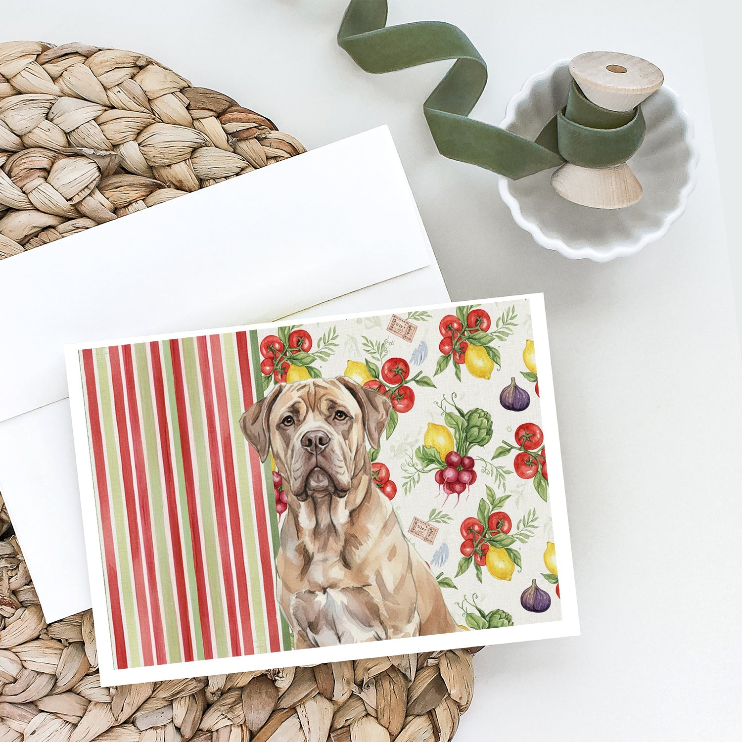 Shown here is the Isabella Dogue de Bordeaux Vegetables Greeting Cards Pack of 8 from Caroline's Treasures featuring artwork of a Dogue de Bordeaux in a Everyday design. The detailed illustration and vibrant colors make it a standout accent that celebrates both seasonal style and love for the subject. This image features a vibrant watercolor vegetable pattern with tomatoes, lemons, artichokes, figs, radishes, and leafy greens arranged in a repeating design, paired with classic red and green stripes. The bright, garden-fresh palette creates a cheerful, farmhouse-inspired look that feels lively, welcoming, and perfect for kitchen décor. Everyday décor celebrates personal style and the small moments that make a house feel like home. Thoughtful designs add warmth and personality that can be enjoyed year-round. Celebrate special moments with Caroline's Treasures Printed Greeting Card Pack. This pack includes eight beautifully folded 5x7 cards, accompanied by eight matching white envelopes. With blank interiors, these cards provide ample space for your personalized messages and heartfelt holiday greetings. Each card features captivating full-color artwork, meticulously printed in our facility on high-quality 80 lb cover stock or 216 GSM. The super smooth finish of the white cards enhances the visual impact of the artwork, creating a truly stunning presentation. Designed by our talented in-house artists or licensed artists, the artwork on these cards showcases their creativity and attention to detail. From vibrant illustrations to captivating designs, each card tells its own unique story. Whether it's for birthdays, anniversaries, holidays, or any special occasion, Caroline's Treasures Greeting Card Pack is the perfect way to convey your heartfelt sentiments. Share joy, love, and warm wishes with these exquisite cards and make every moment unforgettable. Perfect for: Writing personal messages, everyday correspondence, and thoughtful notes, Dogs-themed stationery collections, or year-round use for Dogue de Bordeaux lovers. Dogue de Bordeaux dogs are powerful mastiffs known for their strength and calm demeanor. This French breed is admired for its loyalty, confidence, and steady temperament. Makes a heartfelt gift for: Dogue de Bordeaux owners, Dogs lovers, Everyday gifts, pet parents, friends who adore their Dogue de Bordeaux, or anyone celebrating Dogs.