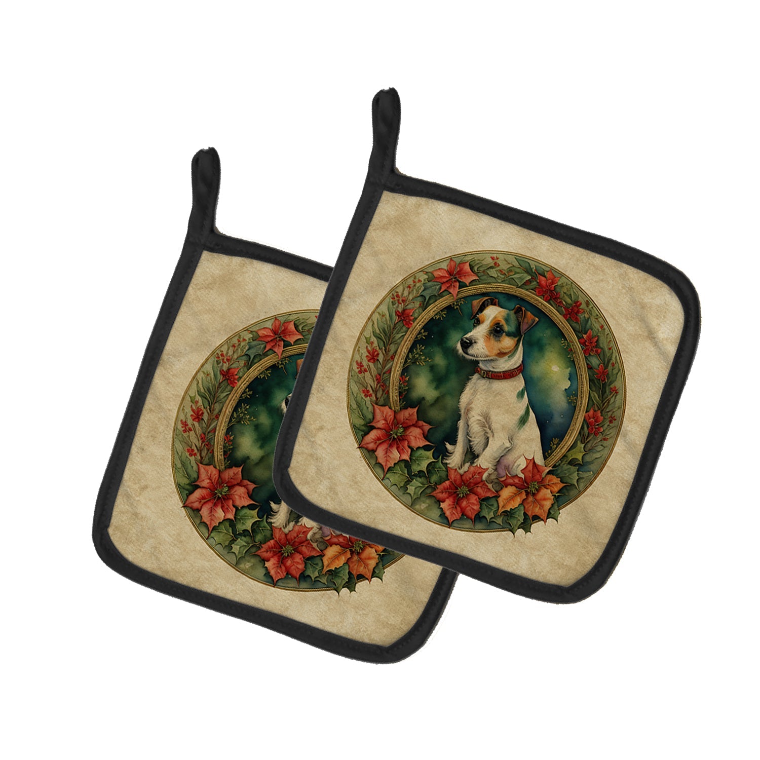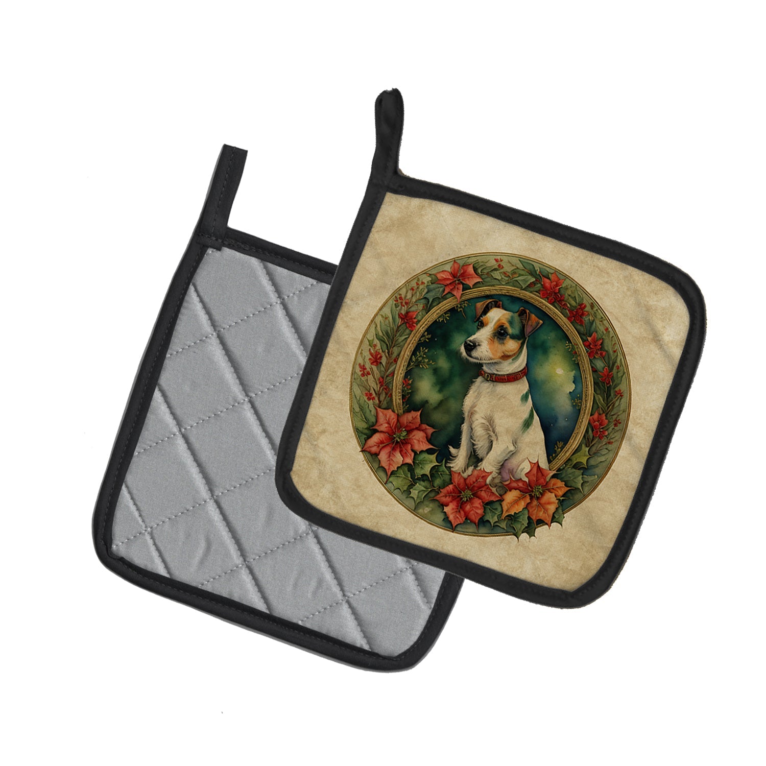Decorate your space with our Christmas Jack Russell Terrier artwork on a Pair of Pot Holders. Bring a bit of Winter into your home with a Winter Pair of Pot Holders. A Pair of Pot Holders to match your kitchen decor. Made in the USA these are thick and functional. Full color artwork decorates the front polyester fabric of the hot pad and accented by a black trim. Use these at as a trivet for your Thanksgiving or Christmas tablescape. Filled with insulated fabric and quilted for durability. These colorful pot holders will make a great gift for your favorite home cook or executive chef. Each pot holder measures approximately 7 1/2 inches by 7 1/2 inches. A hanging tab is included.