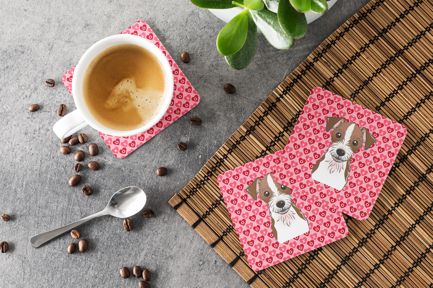 Decorate your space with our Jack Russell Terrier artwork on a Coaster set. Presenting our Set of 4 Foam Coasters, a stylish and practical addition to your table setting. Each square coaster, measuring 3 1/2 inches by 3 1/2 inches, is perfectly sized to accommodate various drinkware, from coffee mugs to tumblers. These coasters stand out with their full-color artwork, permanently dyed onto the material for a vibrant and fade-resistant finish. They're not just functional, they're a fashionable statement, adding a touch of flair to any gathering or event. Our foam coasters serve a dual purpose - they protect your table from water stains and are perfect for both hot and cold drinks. The material used is similar to that of our high-quality mouse pads, ensuring durability and heat resistance. These coasters are easy to maintain - simply wash them in the top of your dishwasher and lay flat to dry. The design won't come off, ensuring they retain their vivid colors for years. Pair them with one of our insulated coolers or huggers for a cohesive, thoughtful gift set. Enhance your beverage experience with our Set of 4 Foam Coasters.