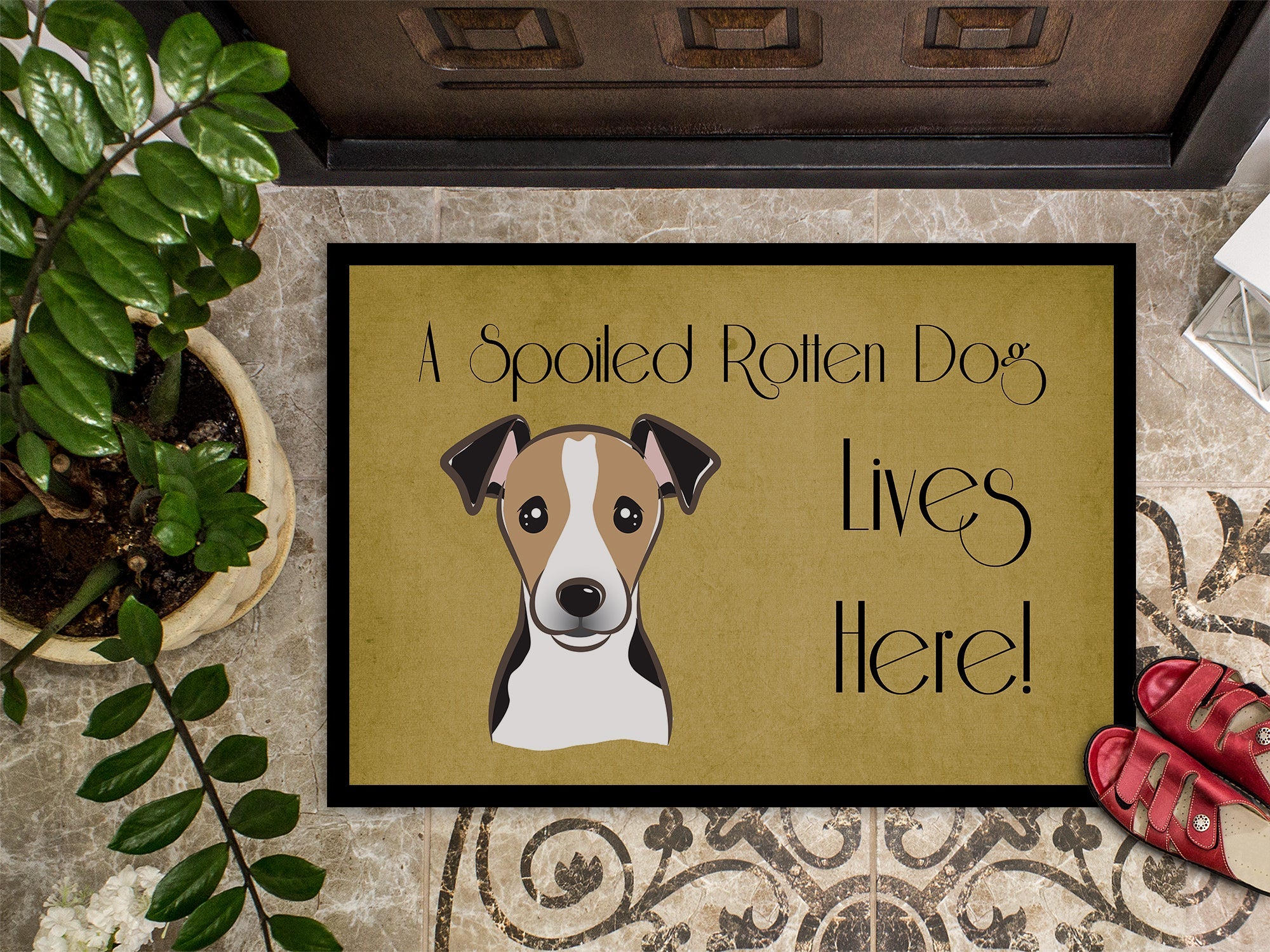 Decorate your space with our Jack Russell Terrier artwork on a Doormat. Welcome your guests in style with our Artwork Door Mat, designed to withstand almost any weather condition. This mat, measuring approximately 24 by 36 inches, is held together by durable black binding tape. Its top layer, composed of polyester felt, is dyed with the eye-catching image you see on the mat. A few layers below provide the mat with stability, while its rubber bottom is stamped to help prevent slipping and ensures safety. Our mat works wonderfully as both an indoor or outdoor door mat. For cleaning, simply hose it off with water or use a power washer - no need for any cleaner that produces suds. Avoid scrubbing with a brush, instead, opt for the vacuum on floor setting. Designed manufactured and printed in the USA, this mat is a perfect addition to your porch, outdoor kitchen, entryway, or any indoor space. Its unique design makes it a charming decorative rug that greets your guests and adds a stylish touch to your home decor.