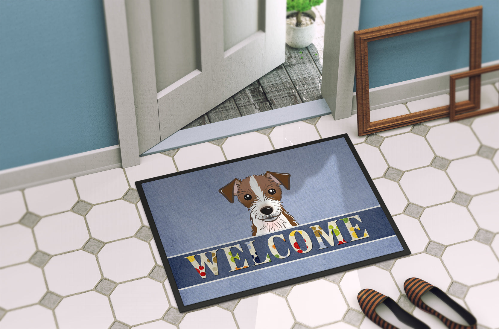 Decorate your space with our Jack Russell Terrier artwork on a Doormat. Welcome your guests in style with our Artwork Door Mat, designed to withstand almost any weather condition. This mat, measuring approximately 24 by 36 inches, is held together by durable black binding tape. Its top layer, composed of polyester felt, is dyed with the eye-catching image you see on the mat. A few layers below provide the mat with stability, while its rubber bottom is stamped to help prevent slipping and ensures safety. Our mat works wonderfully as both an indoor or outdoor door mat. For cleaning, simply hose it off with water or use a power washer - no need for any cleaner that produces suds. Avoid scrubbing with a brush, instead, opt for the vacuum on floor setting. Designed manufactured and printed in the USA, this mat is a perfect addition to your porch, outdoor kitchen, entryway, or any indoor space. Its unique design makes it a charming decorative rug that greets your guests and adds a stylish touch to your home decor.