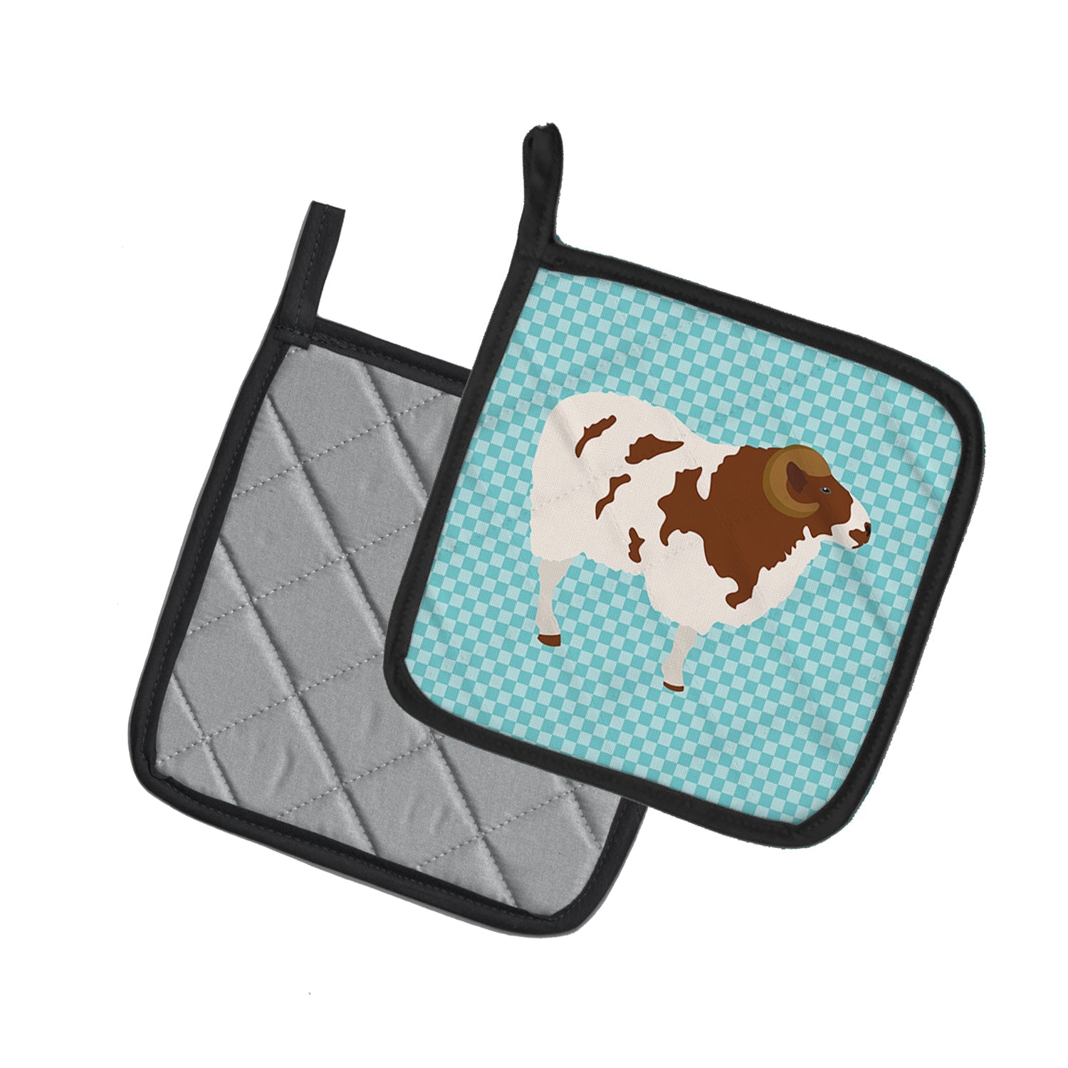 Decorate your space with our Jacob Sheep artwork on a Pair of Pot Holders. A Pair of Pot Holders to match your kitchen decor. Made in the USA these are thick and functional. Full color artwork decorates the front polyester fabric of the hot pad and accented by a black trim. Use these at as a trivet for your Thanksgiving or Christmas tablescape. Filled with insulated fabric and quilted for durability. These colorful pot holders will make a great gift for your favorite home cook or executive chef. Each pot holder measures approximately 7 1/2 inches by 7 1/2 inches. A hanging tab is included.