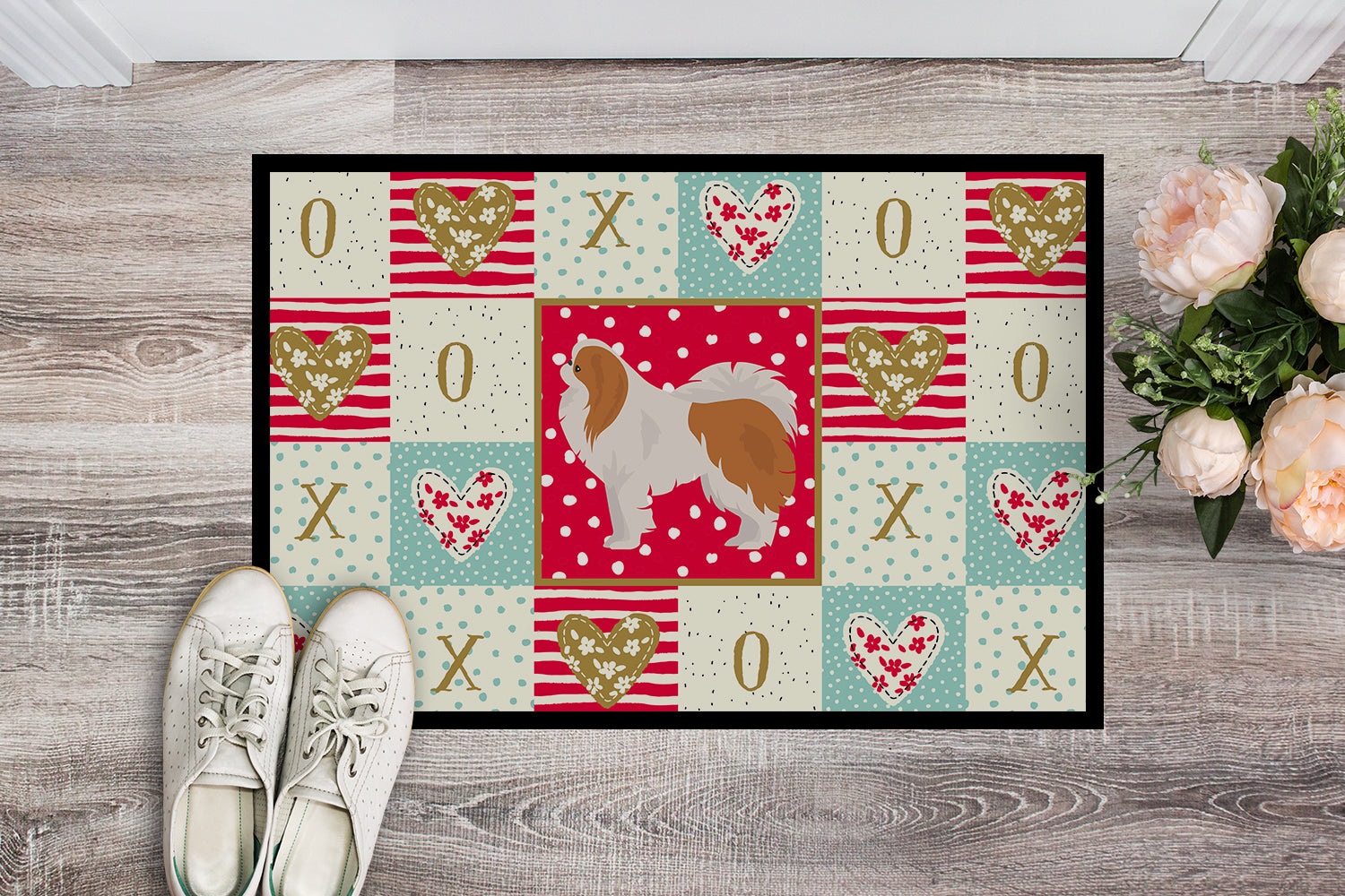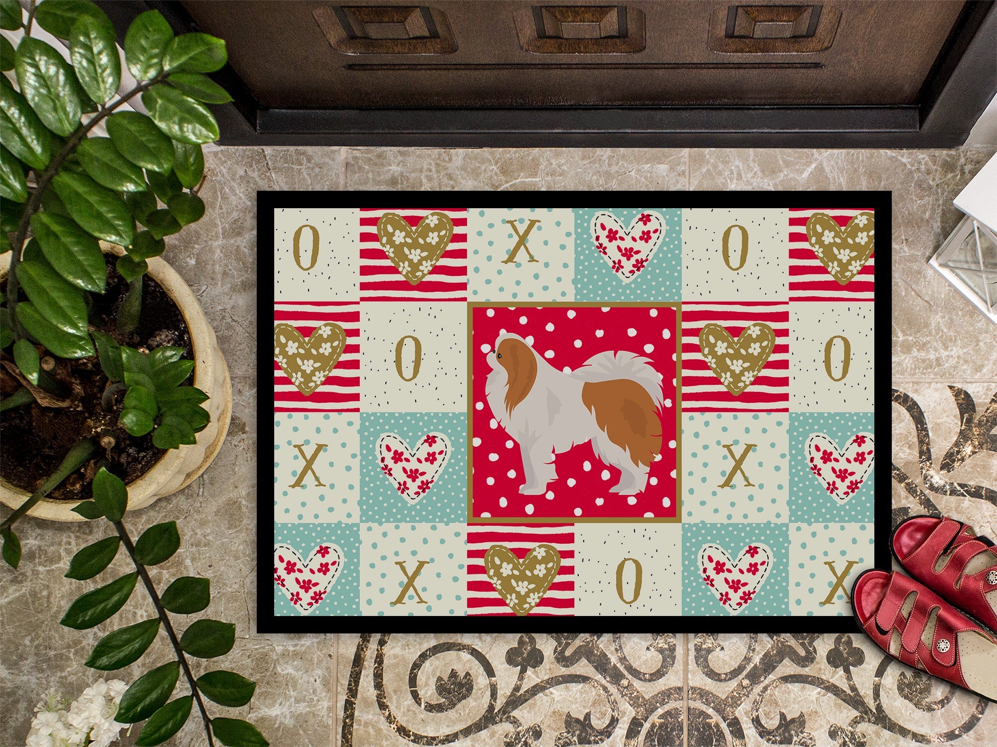 Decorate your space with our Valentine's Day Japanese Chin artwork on a Doormat. Welcome your guests in style with our Artwork Door Mat, designed to withstand almost any weather condition. This mat, measuring approximately 24 by 36 inches, is held together by durable black binding tape. Its top layer, composed of polyester felt, is dyed with the eye-catching image you see on the mat. A few layers below provide the mat with stability, while its rubber bottom is stamped to help prevent slipping and ensures safety. Our mat works wonderfully as both an indoor or outdoor door mat. For cleaning, simply hose it off with water or use a power washer - no need for any cleaner that produces suds. Avoid scrubbing with a brush, instead, opt for the vacuum on floor setting. Designed manufactured and printed in the USA, this mat is a perfect addition to your porch, outdoor kitchen, entryway, or any indoor space. Its unique design makes it a charming decorative rug that greets your guests and adds a stylish touch to your home decor.