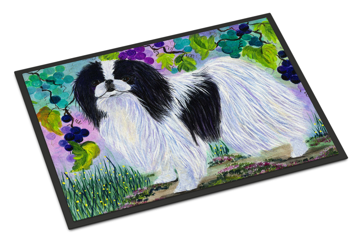 Decorate your space with our Japanese Chin artwork on a Doormat. Welcome your guests in style with our Artwork Door Mat, designed to withstand almost any weather condition. This mat, measuring approximately 24 by 36 inches, is held together by durable black binding tape. Its top layer, composed of polyester felt, is dyed with the eye-catching image you see on the mat. A few layers below provide the mat with stability, while its rubber bottom is stamped to help prevent slipping and ensures safety. Our mat works wonderfully as both an indoor or outdoor door mat. For cleaning, simply hose it off with water or use a power washer - no need for any cleaner that produces suds. Avoid scrubbing with a brush, instead, opt for the vacuum on floor setting. Designed manufactured and printed in the USA, this mat is a perfect addition to your porch, outdoor kitchen, entryway, or any indoor space. Its unique design makes it a charming decorative rug that greets your guests and adds a stylish touch to your home decor.