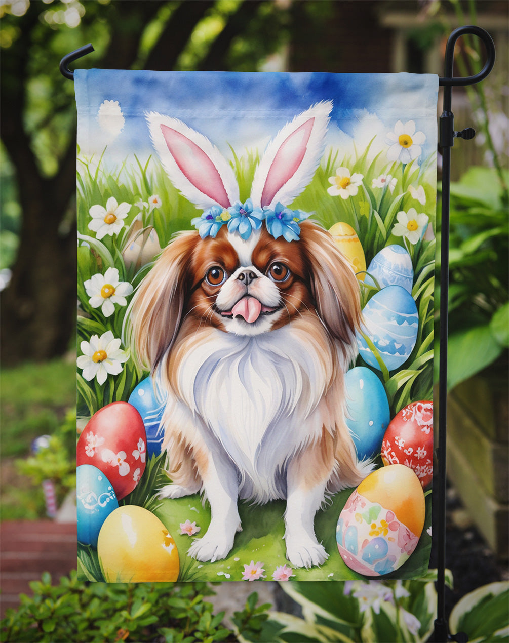 Decorate your space with our Easter Japanese Chin artwork on a Garden Flag. Enhance the beauty of your garden, patio, or yard with Caroline's Treasures Decorative Garden Flag, proudly made in the USA. Crafted from two pieces of thick, double-sided polyester fabric, this 2-ply garden flag is designed to withstand various weather conditions, making it water-resistant and weatherproof. Featuring correctly readable words on both sides, this garden flag offers a delightful visual experience from any angle. With its heavier weight, it stands out among other garden flags, ensuring stability and durability even in wind, rain, and snow. Measuring approximately 11 1/4 inches by 15 1/2 inches, this flag allows you to personalize your outdoor decor. It comes with a 1 1/2-inch sleeve sewn in, allowing easy attachment to any standard garden flag stand or garden size porch hanger (sold separately). Make a statement in your outdoor space with Caroline's Treasures Decorative Garden Flag, a vibrant and high-quality flag that adds color and personality to your surroundings. Proudly made in the USA, it's a symbol of quality craftsmanship and attention to detail.
