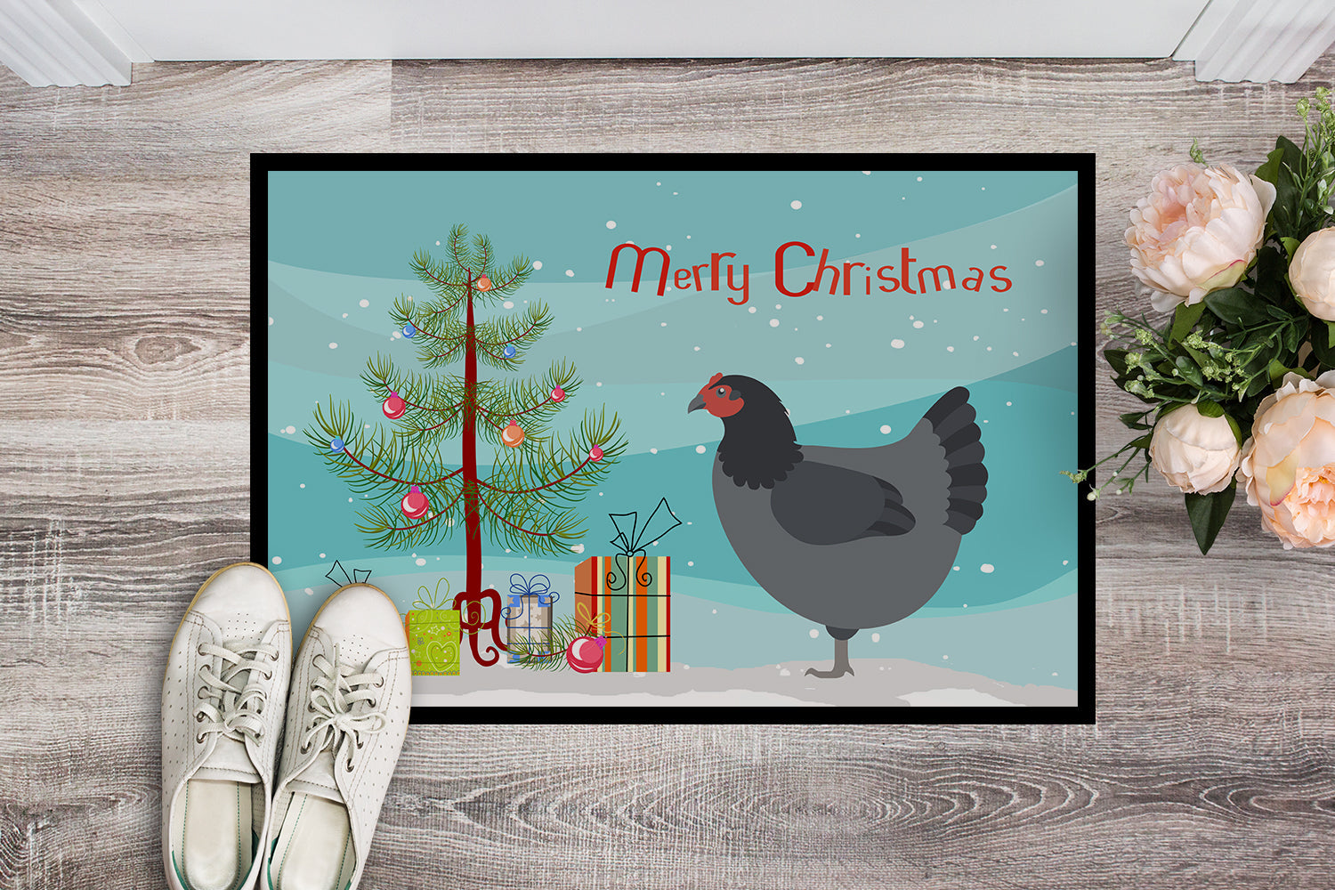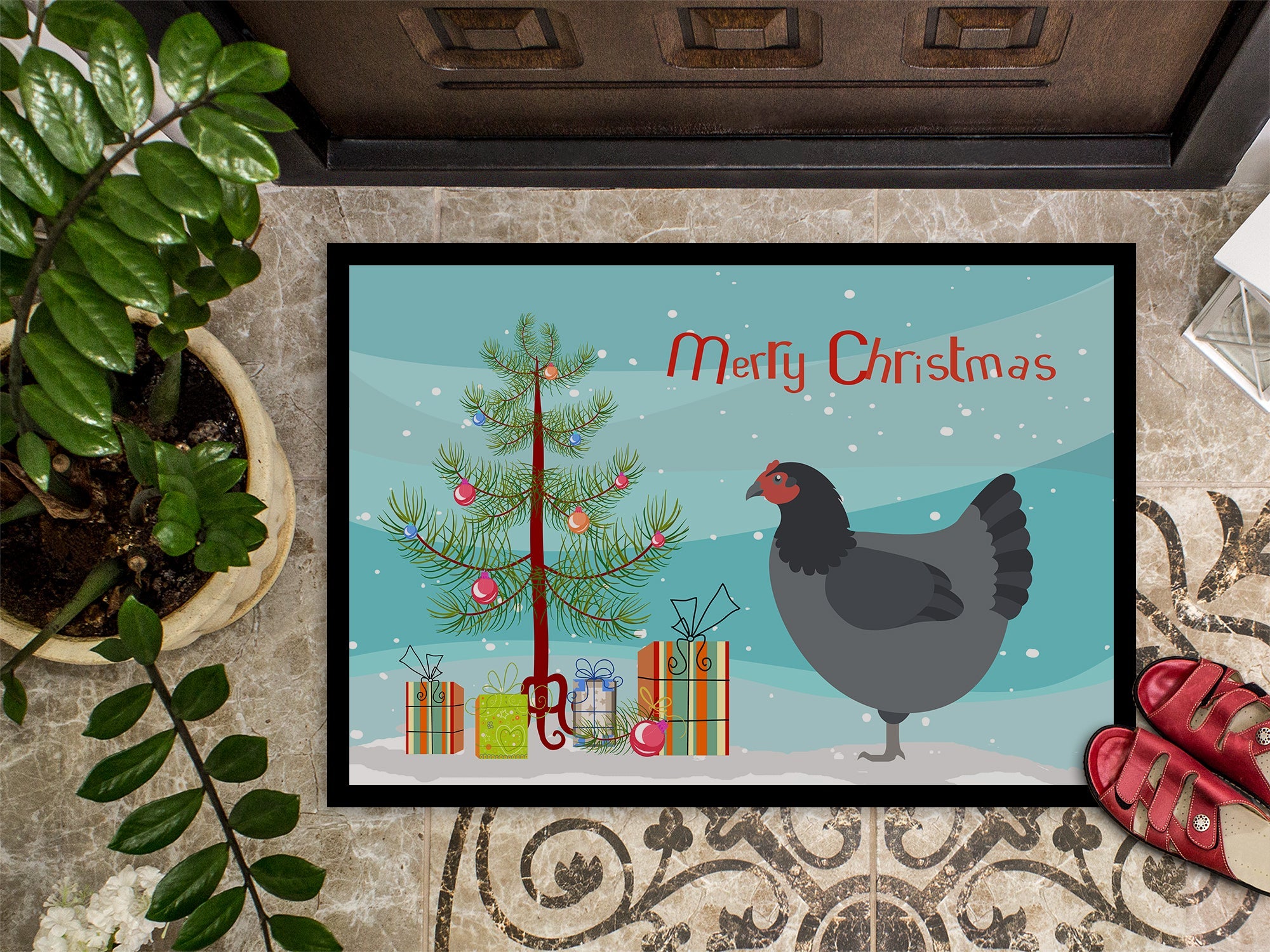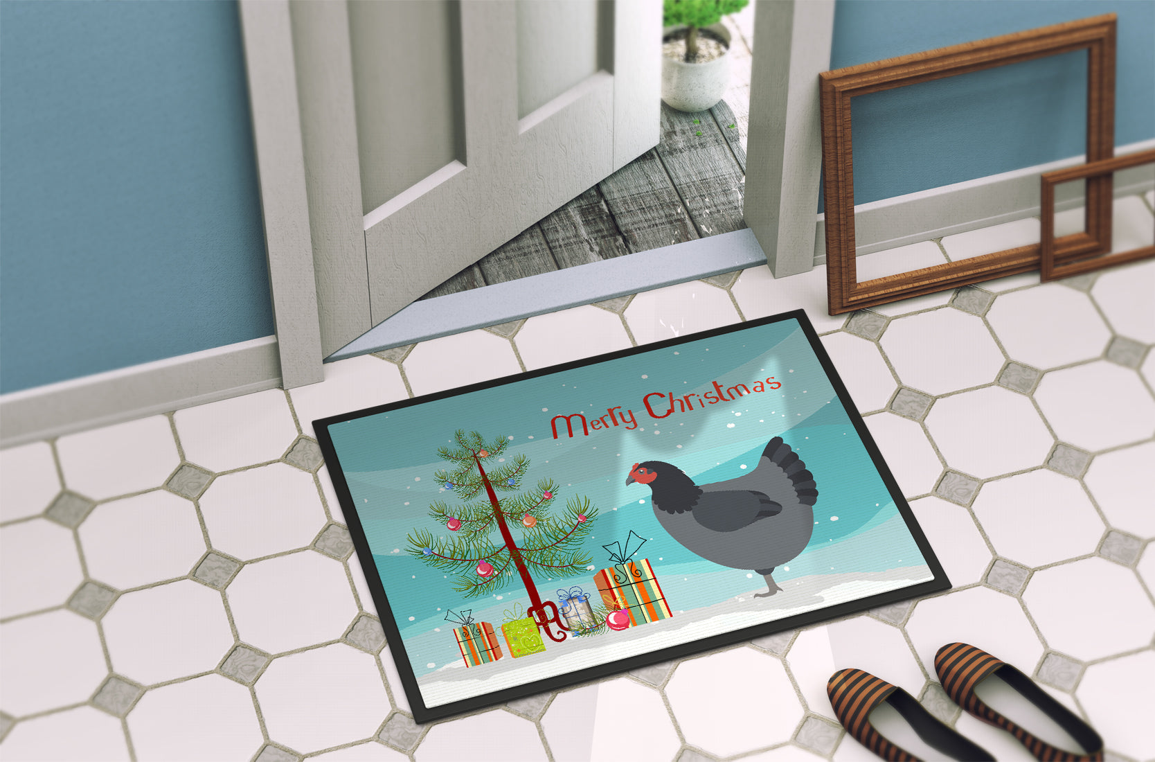 Decorate your space with our Christmas Jersey Giant Chicken artwork on a Doormat. Welcome your guests in style with our Artwork Door Mat, designed to withstand almost any weather condition. This mat, measuring approximately 18 by 27 inches, is held together by durable black binding tape. Its top layer, composed of polyester felt, is dyed with the eye-catching image you see on the mat. A few layers below provide the mat with stability, while its rubber bottom is stamped to help prevent slipping and ensures safety. Our mat works wonderfully as both an indoor or outdoor door mat. For cleaning, simply hose it off with water or use a power washer - no need for any cleaner that produces suds. Avoid scrubbing with a brush, instead, opt for the vacuum on floor setting. Designed manufactured and printed in the USA, this mat is a perfect addition to your porch, outdoor kitchen, entryway, or any indoor space. Its unique design makes it a charming decorative rug that greets your guests and adds a stylish touch to your home decor.