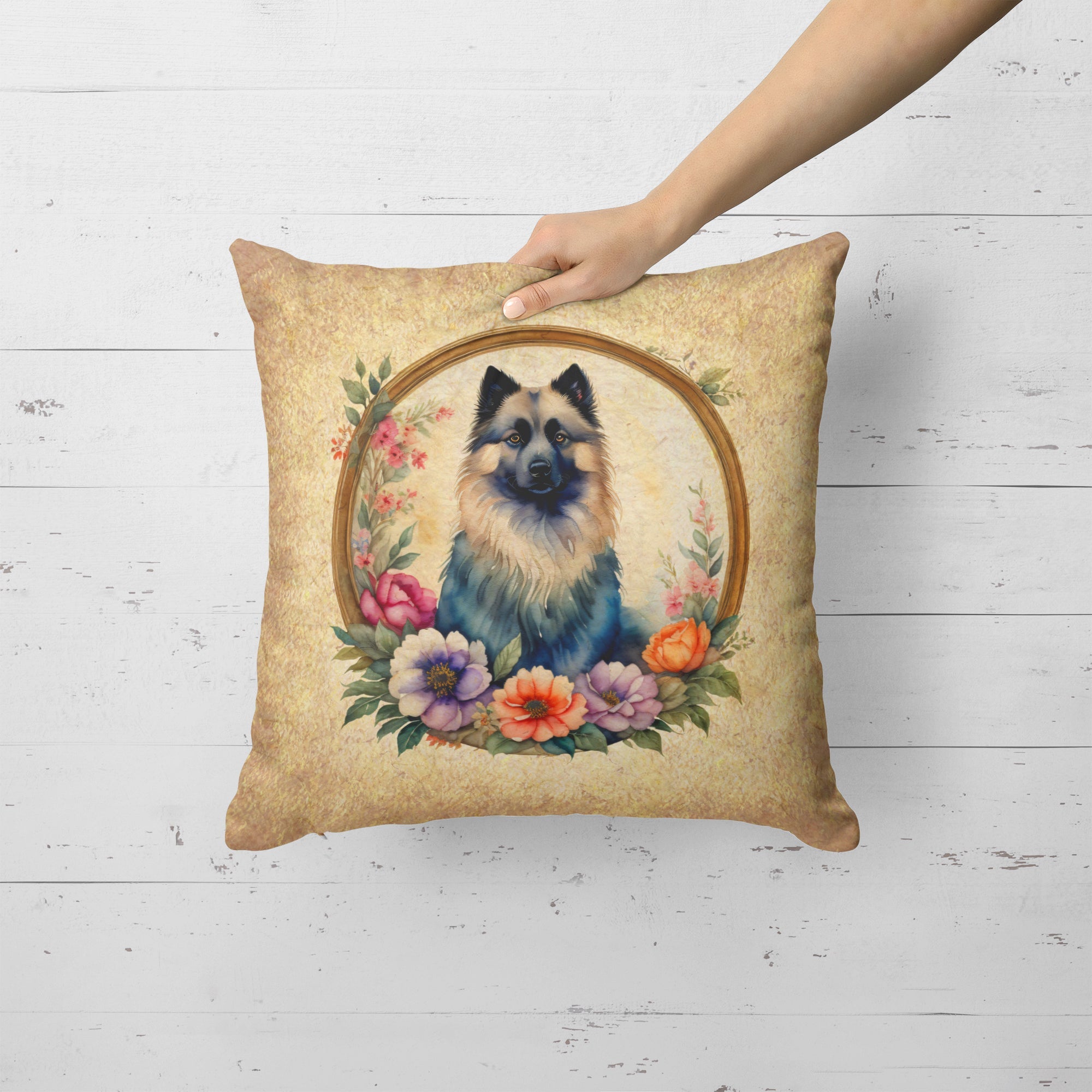 Decorate your space with our Keeshond artwork on a Pillow. Bring a bit of Spring into your home with a Spring Pillow. Revitalize your outdoor or indoor living space with Caroline's Treasures 18x18 Fabric Decorative Pillow. With a generously sized dimension of approximately 18 inches by 18 inches, this pillow makes a comfortable and aesthetic addition to any seating area. Made from a unique, water-resistant material developed by Caroline's Treasures, the pillow sham is 100% polyester fabric that's durable and ready to weather any condition. Its vibrant, full-color artwork will not fade over time as it is dyed with color-fast dyes. Whether you place it on your patio furniture, porch, veranda, or indoor couch, its soft canvas fabric ensures a cozy experience. The pillow is handcrafted in the United States, featuring a sham created from three pieces of fabric and a polyester insert for enduring shape and overstuffed comfort. Despite being robustly built to endure the outdoors, it is as soft and snug as your favorite indoor cushions. Please note, as all our pillows are handmade, sizes may vary slightly, adding to the charm of this unique decorative item.