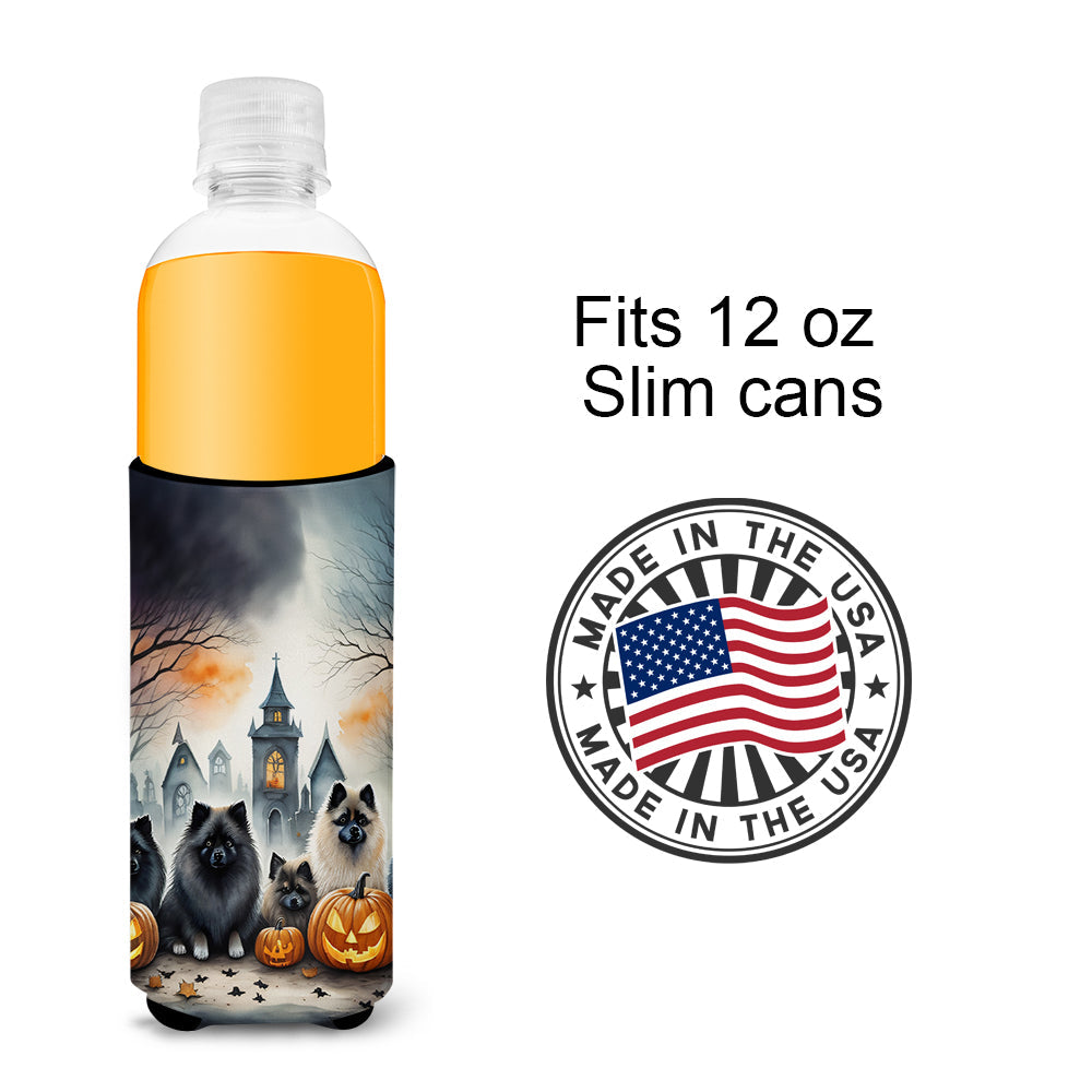 Decorate your space with our Halloween Keeshond artwork on a Slim Can Hugger. Elevate your beverage experience with our Slim Can Huggers, uniquely designed to fit a variety of your favorite 12 oz slim cans. Perfectly suited for Michelob Ultra, Starbucks Refreshers, Heineken Light, Bud Lite Lime, Dry Soda, Coors, Resin, Vitaminwater Energy, and Perrier Cans, our huggers ensure your drink stays refreshingly cool. The feature that sets our can huggers apart is the striking full-color artwork, exclusively created by one of our talented artists. It adds a touch of individuality and style to your drink, making it easier to identify in a crowd. A unique blend of practicality and flair, these huggers are an absolute must-have at any gathering. Our can huggers are not just beautiful but also incredibly durable. The design won't fade or peel off, and they can be safely cleaned in a washing machine. These collapsible beverage insulators are easy to store and transport, making them perfect for all occasions. Enjoy your drinks in style and comfort with our exceptional Slim Can Huggers.