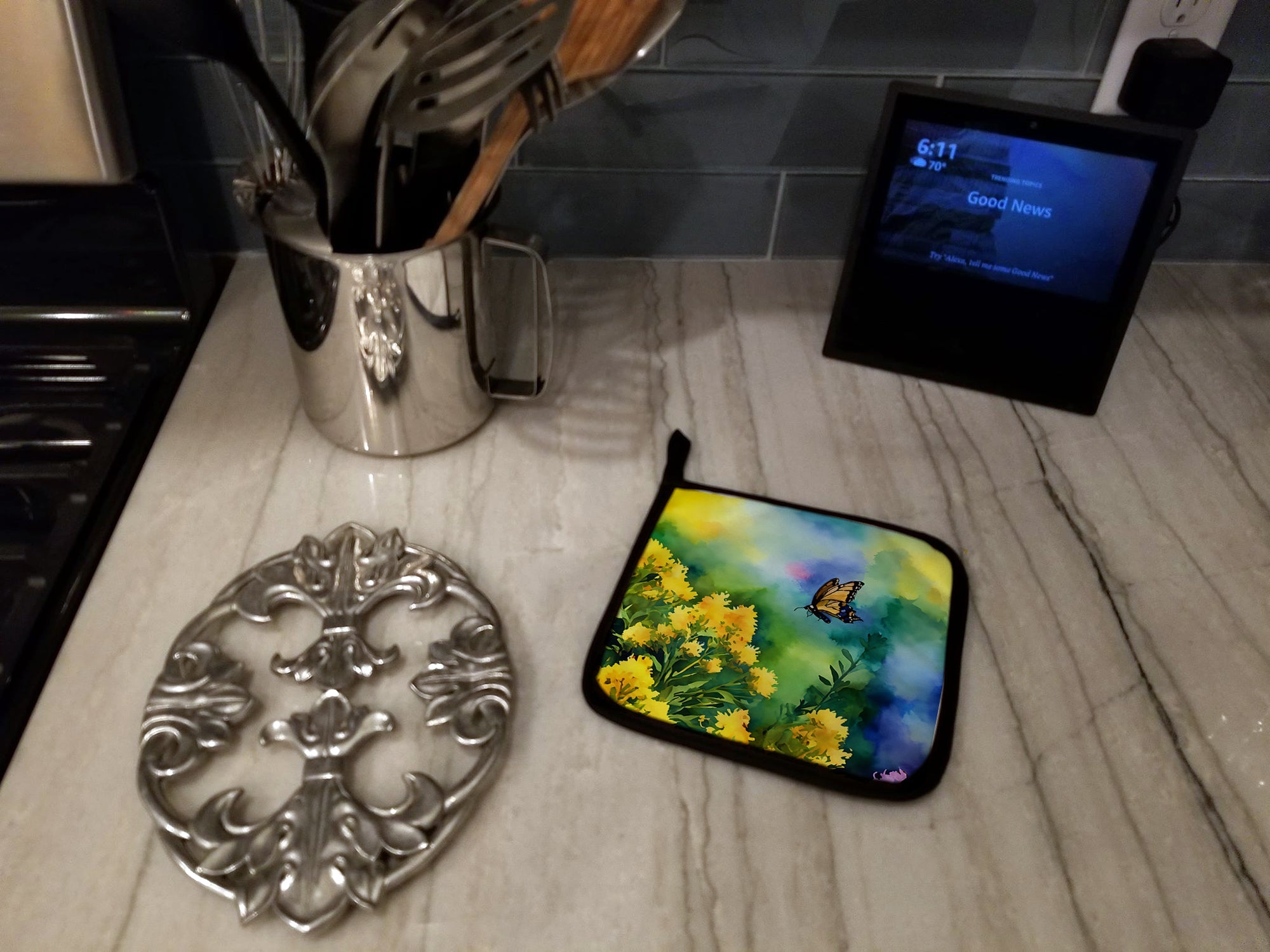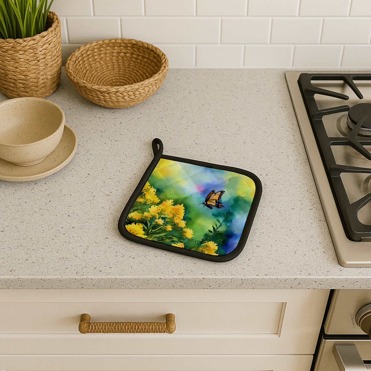 Pair of Pot Holders featuring breed specific Kentucky Goldenrod artwork. A Pair of Pot Holders to match your kitchen decor. Made in the USA these are thick and functional. Full color artwork decorates the front polyester fabric of the hot pad and accented by a black trim. Use these at as a trivet for your Thanksgiving or Christmas tablescape. Filled with insulated fabric and quilted for durability. These colorful pot holders will make a great gift for your favorite home cook or executive chef. Each pot holder measures approximately 7 1/2 inches by 7 1/2 inches. A hanging tab is included.