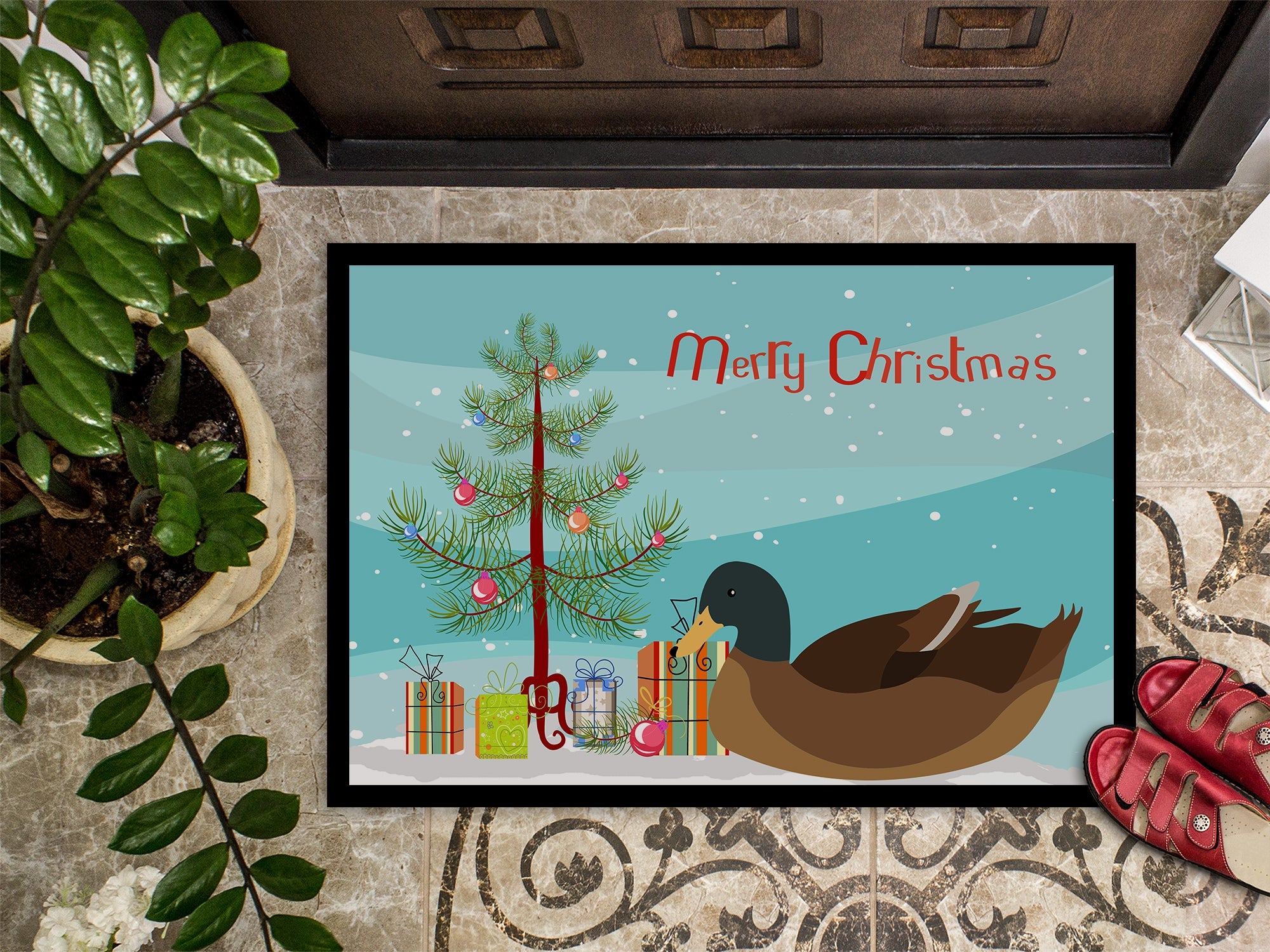 Decorate your space with our Christmas Khaki Campbell Duck artwork on a Doormat. Welcome your guests in style with our Artwork Door Mat, designed to withstand almost any weather condition. This mat, measuring approximately 18 by 27 inches, is held together by durable black binding tape. Its top layer, composed of polyester felt, is dyed with the eye-catching image you see on the mat. A few layers below provide the mat with stability, while its rubber bottom is stamped to help prevent slipping and ensures safety. Our mat works wonderfully as both an indoor or outdoor door mat. For cleaning, simply hose it off with water or use a power washer - no need for any cleaner that produces suds. Avoid scrubbing with a brush, instead, opt for the vacuum on floor setting. Designed manufactured and printed in the USA, this mat is a perfect addition to your porch, outdoor kitchen, entryway, or any indoor space. Its unique design makes it a charming decorative rug that greets your guests and adds a stylish touch to your home decor.