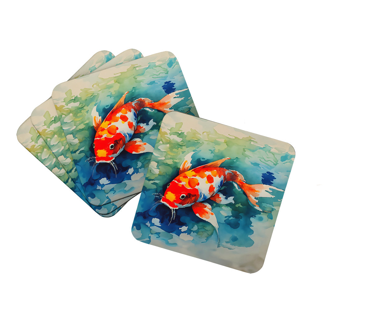 Decorate your space with our Koi Fish artwork on a Coaster set. Presenting our Set of 4 Foam Coasters, a stylish and practical addition to your table setting. Each square coaster, measuring 3 1/2 inches by 3 1/2 inches, is perfectly sized to accommodate various drinkware, from coffee mugs to tumblers. These coasters stand out with their full-color artwork, permanently dyed onto the material for a vibrant and fade-resistant finish. They're not just functional, they're a fashionable statement, adding a touch of flair to any gathering or event. Our foam coasters serve a dual purpose - they protect your table from water stains and are perfect for both hot and cold drinks. The material used is similar to that of our high-quality mouse pads, ensuring durability and heat resistance. These coasters are easy to maintain - simply wash them in the top of your dishwasher and lay flat to dry. The design won't come off, ensuring they retain their vivid colors for years. Pair them with one of our insulated coolers or huggers for a cohesive, thoughtful gift set. Enhance your beverage experience with our Set of 4 Foam Coasters.