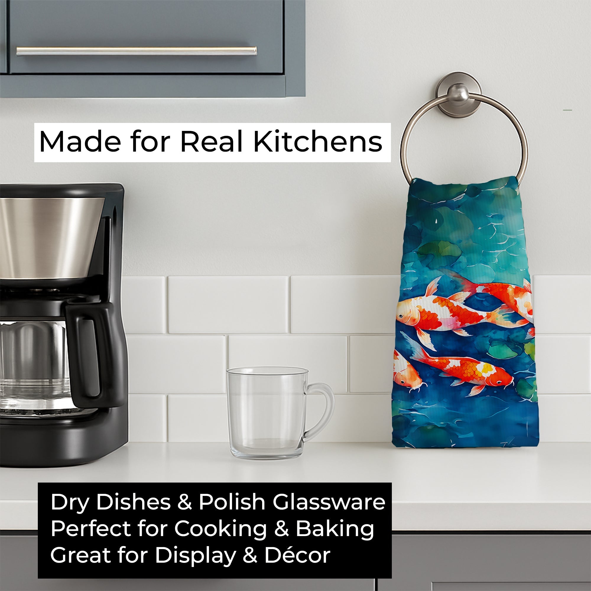 Shown here is the Koi Fish Kitchen Towel from Caroline's Treasures featuring artwork of a Koi Fish in a Everyday design. The detailed illustration and vibrant colors make it a standout accent that celebrates both seasonal style and love for the subject. Set sail into seaside style with our Nautical Collection. Featuring coastal-inspired designs anchored in classic ocean motifs and breezy charm, this collection brings relaxed personality and timeless décor to your home and thoughtful gifts for lovers of coastal living. Everyday décor celebrates personal style and the small moments that make a house feel like home. Thoughtful designs add warmth and personality that can be enjoyed year-round. Bring cozy everyday charm to your sink or powder room with a plush velour towel featuring original watercolor artwork. The front is a soft, color-rich minky polyester that polishes glassware to a brilliant shine; the back is 100% white cotton terry loop for quick absorbency on hands, dishes, and counters. Artwork is dyed into the fibers for lasting color that won’t crack or peel. Finished edges keep the shape wash after wash. Size: 15" x 25". Machine wash; tumble dry low. Designed and printed in the USA. Perfect for: Kitchen counters, ovens, and towel bars, everyday drying and cleanup, Fish-themed kitchens, or year-round use for Koi Fish lovers. Koi fish feature vibrant patterns and smooth movement. Their appearance feels serene and ornamental. Makes a heartfelt gift for: Koi Fish owners, Fish lovers, Everyday gifts, pet parents, friends who adore their Koi Fish, or anyone celebrating Fish.