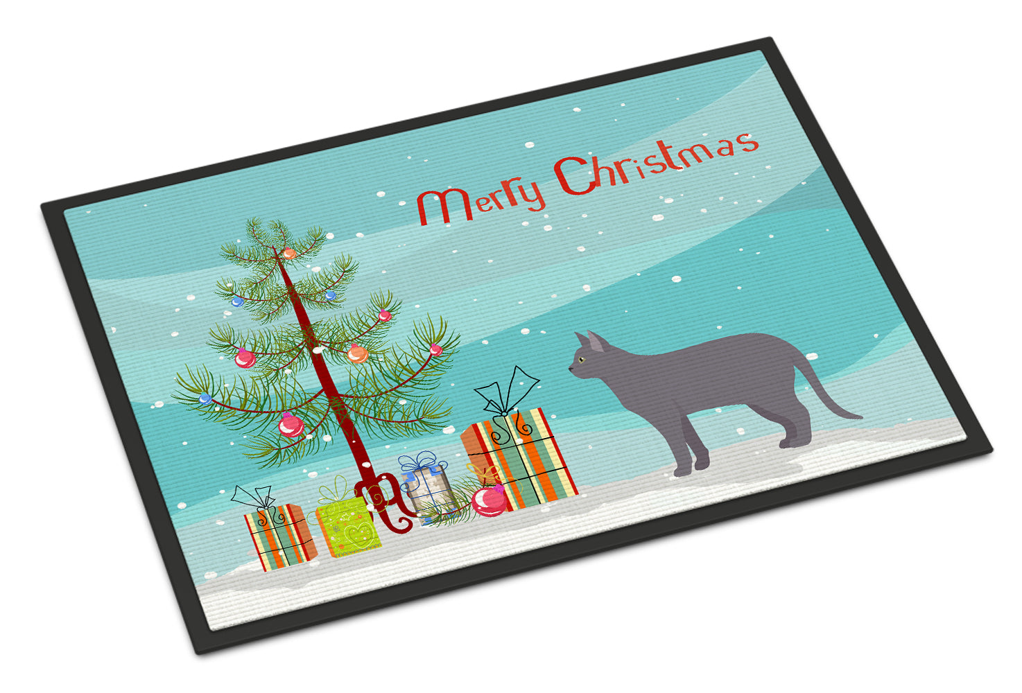 Decorate your space with our Christmas Korat artwork on a Doormat. Welcome your guests in style with our Artwork Door Mat, designed to withstand almost any weather condition. This mat, measuring approximately 18 by 27 inches, is held together by durable black binding tape. Its top layer, composed of polyester felt, is dyed with the eye-catching image you see on the mat. A few layers below provide the mat with stability, while its rubber bottom is stamped to help prevent slipping and ensures safety. Our mat works wonderfully as both an indoor or outdoor door mat. For cleaning, simply hose it off with water or use a power washer - no need for any cleaner that produces suds. Avoid scrubbing with a brush, instead, opt for the vacuum on floor setting. Designed manufactured and printed in the USA, this mat is a perfect addition to your porch, outdoor kitchen, entryway, or any indoor space. Its unique design makes it a charming decorative rug that greets your guests and adds a stylish touch to your home decor.