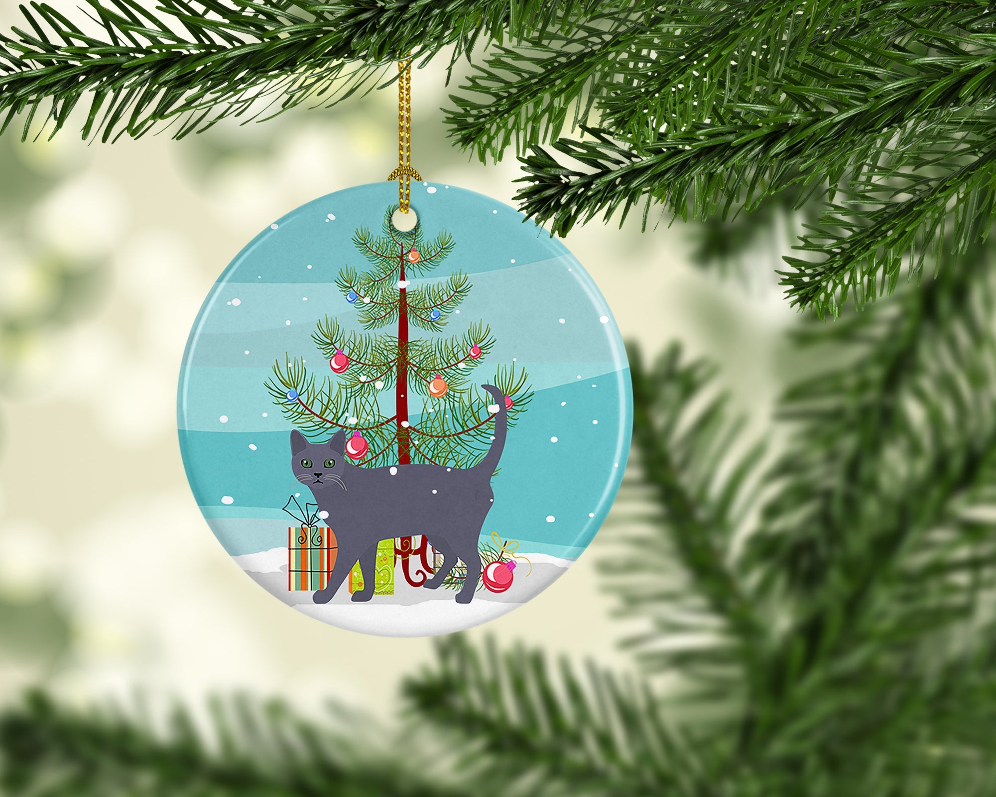 Decorate your space with our Christmas Korat artwork on a Ornament. Add a touch of personalized charm to your Christmas tree this holiday season with our Ceramic Ornament. Measuring 2.8125 inches in diameter, this round porcelain ornament beautifully reflects your festive lights, enhancing your holiday decor. The gloss surface sets off the vibrant, full-color artwork contributed by one of our talented artists, bringing a pop of color and joy to your tree. This Ceramic Ornament doesn't stop at being merely decorative. The white back is designed for personalization. Write a heartfelt message, mark a special year, or inscribe a date with a paint pen or a permanent marker to create a treasured memento. Please ensure you allow any personalization to dry thoroughly before handling to maintain the pristine finish. Included with the ornament is a delicate gold cord for easy hanging. Made in the USA, this Ceramic Ornament makes an exceptional gift for a pet sitter, teacher, family member, or anyone you wish to share a little Christmas magic with. With its blend of style, charm, and personal touch, it's a meaningful addition to any Christmas tree.