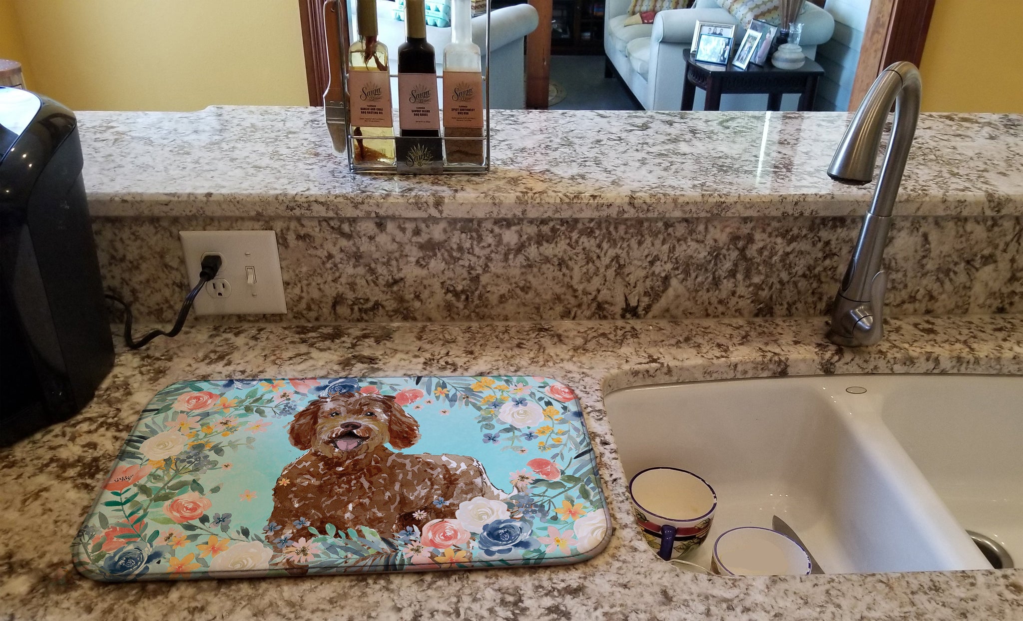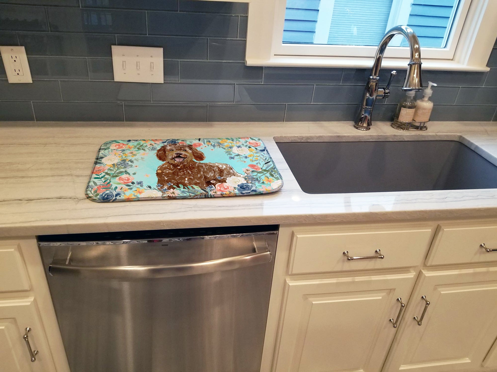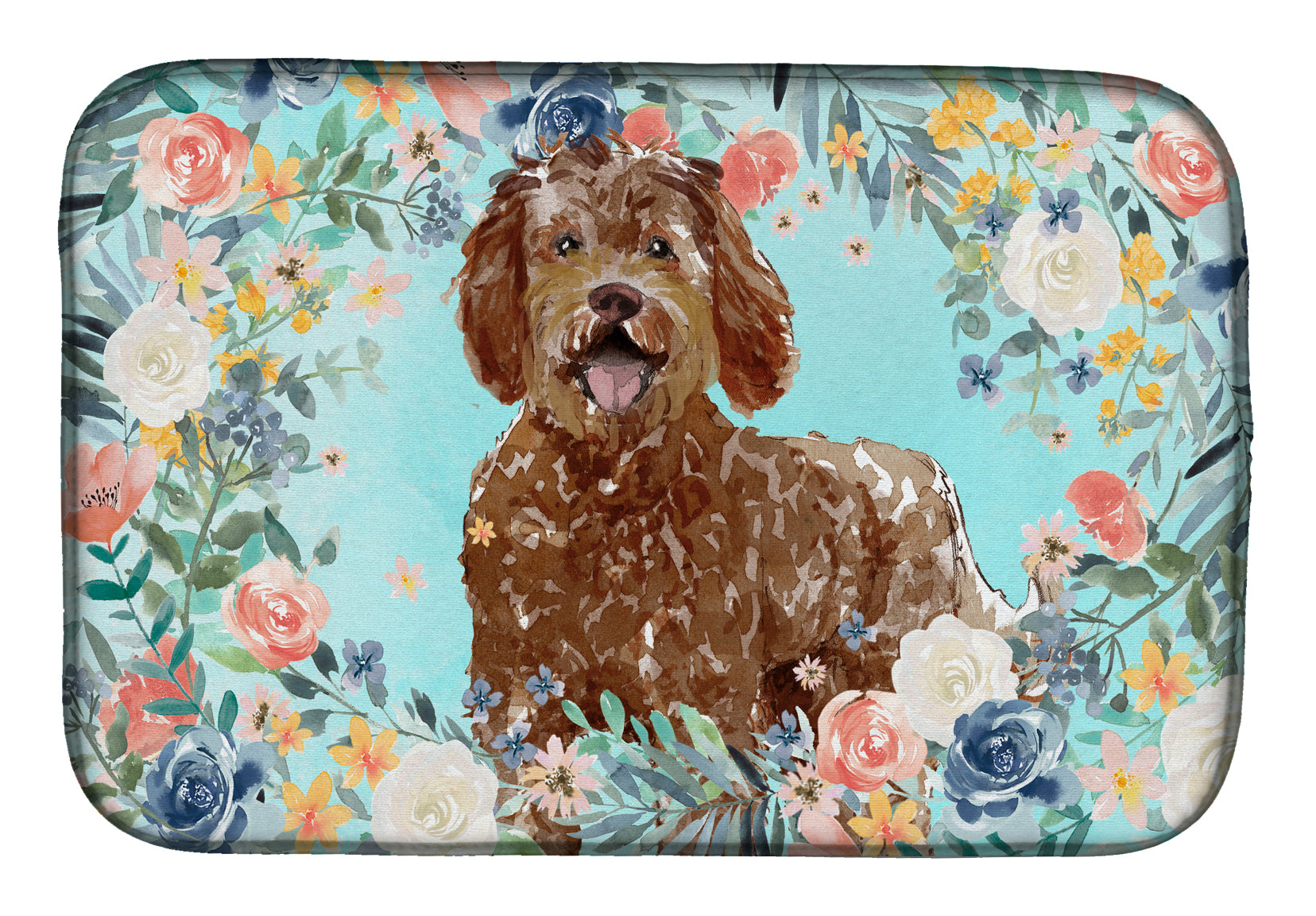 Decorate your space with our Labradoodle artwork on a Dish Drying Mat. Say goodbye to messy countertops and soggy dish towels with our innovative dish drying mat. Our high-quality dish drying pad is designed to keep your countertops dry while offering a stylish and efficient solution. Whether you're air drying dishes, glasses, stemware, silverware, pots, pans, bottles, or even fruits and vegetables, our dish mat is the perfect choice. The 14 inches x 22 inches size fits most counters and dish drying racks, and the non-slip design ensures stability. Made with water-absorbent polyester and a polyurethane foam insert, our dish drying mat is not only functional but also durable. It's machine washable and printed in the USA for long-lasting use. The beautiful artwork adds flair to your kitchen decor, making it a perfect housewarming gift or present for any occasion. Upgrade your kitchen experience with our absorbent and versatile dish drying mat.