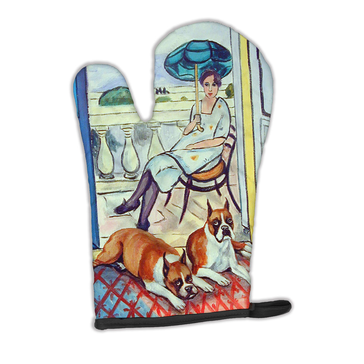 Decorate your space with our Boxer artwork on a Oven Mitt. Presenting our Large Right Hand Thick Heat Resistant Oven Mitt, an indispensable tool for any culinary enthusiast. This mitt boasts layers of quilted protection on both sides, providing outstanding resistance against extreme heat. Embellished with beautifully printed artwork, it adds an extra dash of charm to your kitchen decor. At about 12 inches long and 8 1/2 inches wide, this oven mitt offers a generous fit, accommodating a diverse range of hand sizes. Its design is enhanced by a sleek Black bias tape trim, finished with a convenient hoop for easy hanging. Fresh out of the packaging, the quilting process may give the mitt a stiff feel, but rest assured, it will soften with use and washing. Our mitt is crafted with a unique center fabric, Insul-Bright, a composite material made from polyester fibers, needle-punched through a nonwoven substrate and a reflective metallized film. This smart material resists both conduction and radiant energy, reflecting heat back to its source, all while remaining breathable. Our oven mitt is machine washable and safe for tumble drying. It's a perfect gift for your favorite Chef, BBQ enthusiast, or just a little treat for yourself! Experience safety, style, and convenience rolled into one with this exceptional oven mitt.
