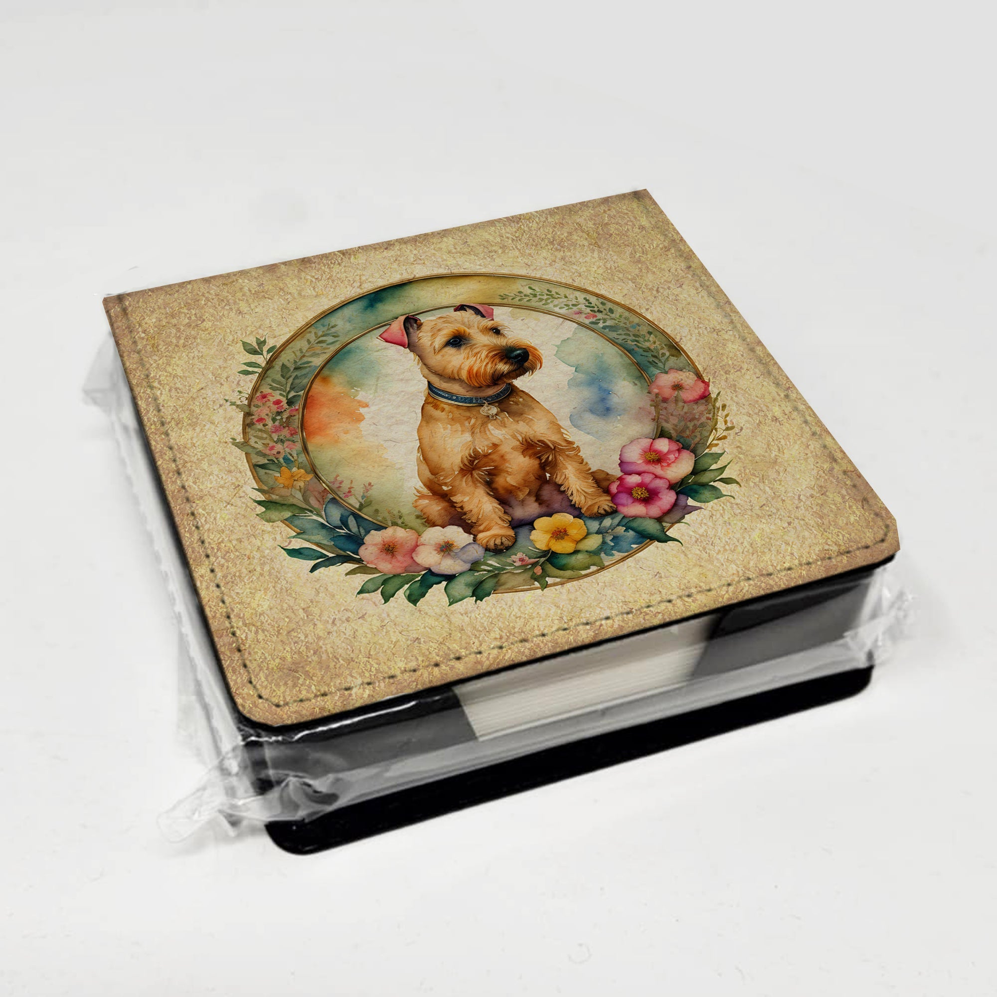 PU Leather Note Paper Holder featuring breed specific Lakeland Terrier artwork. Elevate your workspace with this PU Leather Note Paper Holder, crafted to resemble luxurious leather without the use of animal products. Made from durable synthetic PU leather, it offers both a premium look and eco-friendly appeal. This note holder, compactly sized at 4.25 x 4.25 x 1.25 inches, includes about 160 sheets of 3.75 x 3.75-inch note paper—ideal for quick notes and reminders. An exclusive artist-designed cover makes each holder uniquely vibrant, adding a splash of color and personality to any desk or office. The discrete design keeps note paper hidden, maintaining a neat and organized workspace. Perfect as a gift or for personal use, this stylish holder is refillable with standard paper, ensuring long-lasting utility. A must-have for anyone seeking a sophisticated, artful touch to their workspace while supporting animal-friendly products. Add style, organization, and creativity to your everyday routine with this elegant note paper holder.