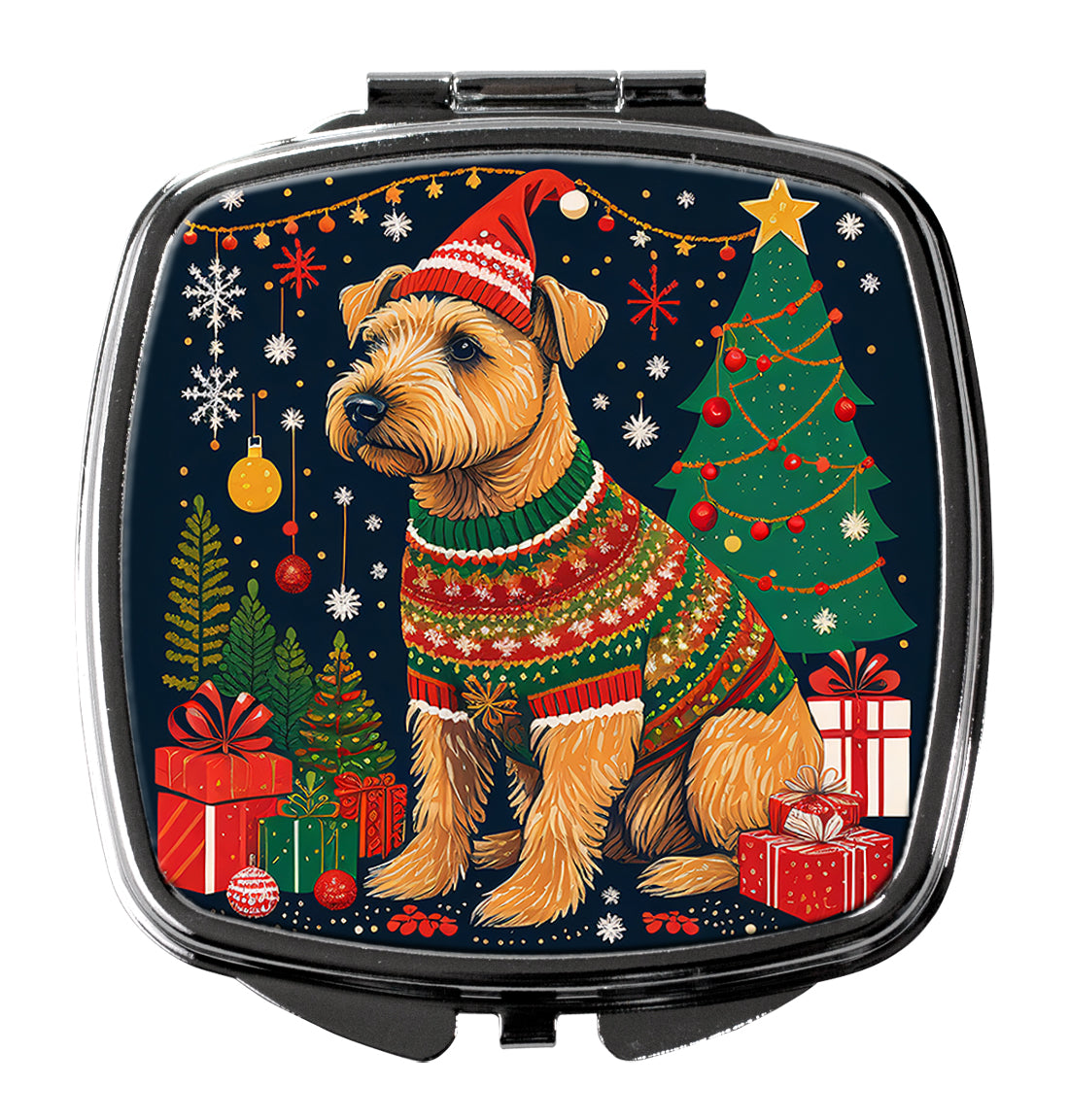 Decorate your space with our Christmas Lakeland Terrier artwork on a Compact Mirror. Introducing our Square Compact Mirror, a blend of elegance, functionality, and compactness, perfect for on-the-go touch-ups. This Silvertone metal mirror, with dimensions of 2.75 inches x 3 inches x .3 inches, fits effortlessly into your purse, handbag, or pocket, ensuring that you can check your appearance anytime, anywhere. Our compact mirror stands out with its eye-catching artwork on the front, adding a dash of style to this practical accessory. It is more than just a mirror; it's a statement piece that reflects your personality and aesthetic. When opened, this compact reveals two mirrors inside, doubling your perspective for precise touch-ups. The Silvertone metal construction ensures durability while maintaining a lightweight feel, making it an ideal everyday carry item. Whether you're rushing to a meeting, prepping for a dinner date, or just need a quick check on your look, our Square Compact Mirror is your reliable companion. Experience the perfect blend of style and practicality with this must-have accessory.
