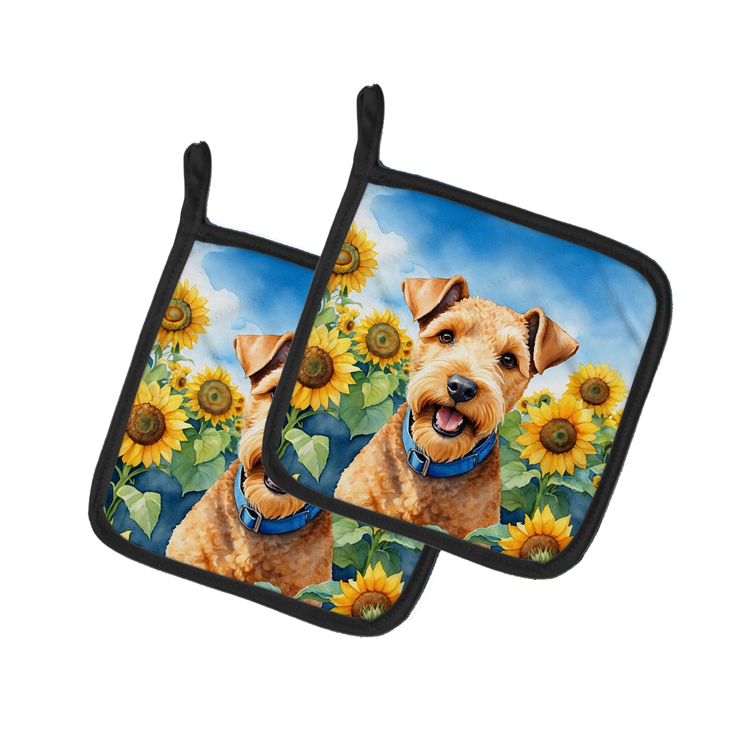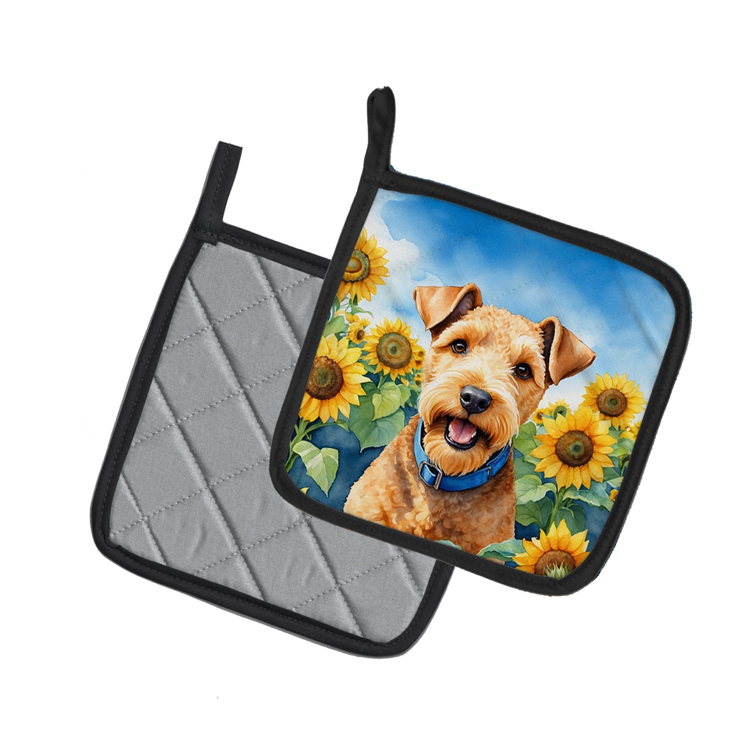 Decorate your space with our Lakeland Terrier artwork on a Pair of Pot Holders. Bring a bit of Summer into your home with a Summer Pair of Pot Holders. A Pair of Pot Holders to match your kitchen decor. Made in the USA these are thick and functional. Full color artwork decorates the front polyester fabric of the hot pad and accented by a black trim. Use these at as a trivet for your Thanksgiving or Christmas tablescape. Filled with insulated fabric and quilted for durability. These colorful pot holders will make a great gift for your favorite home cook or executive chef. Each pot holder measures approximately 7 1/2 inches by 7 1/2 inches. A hanging tab is included.