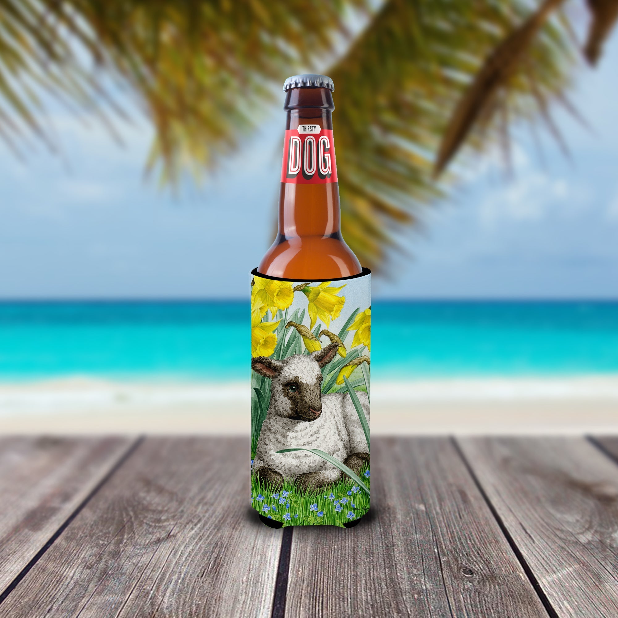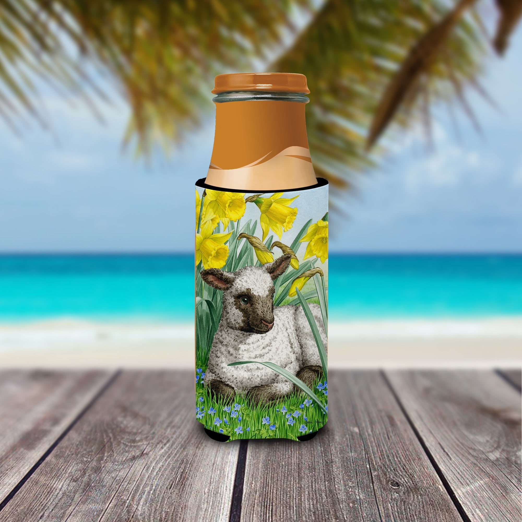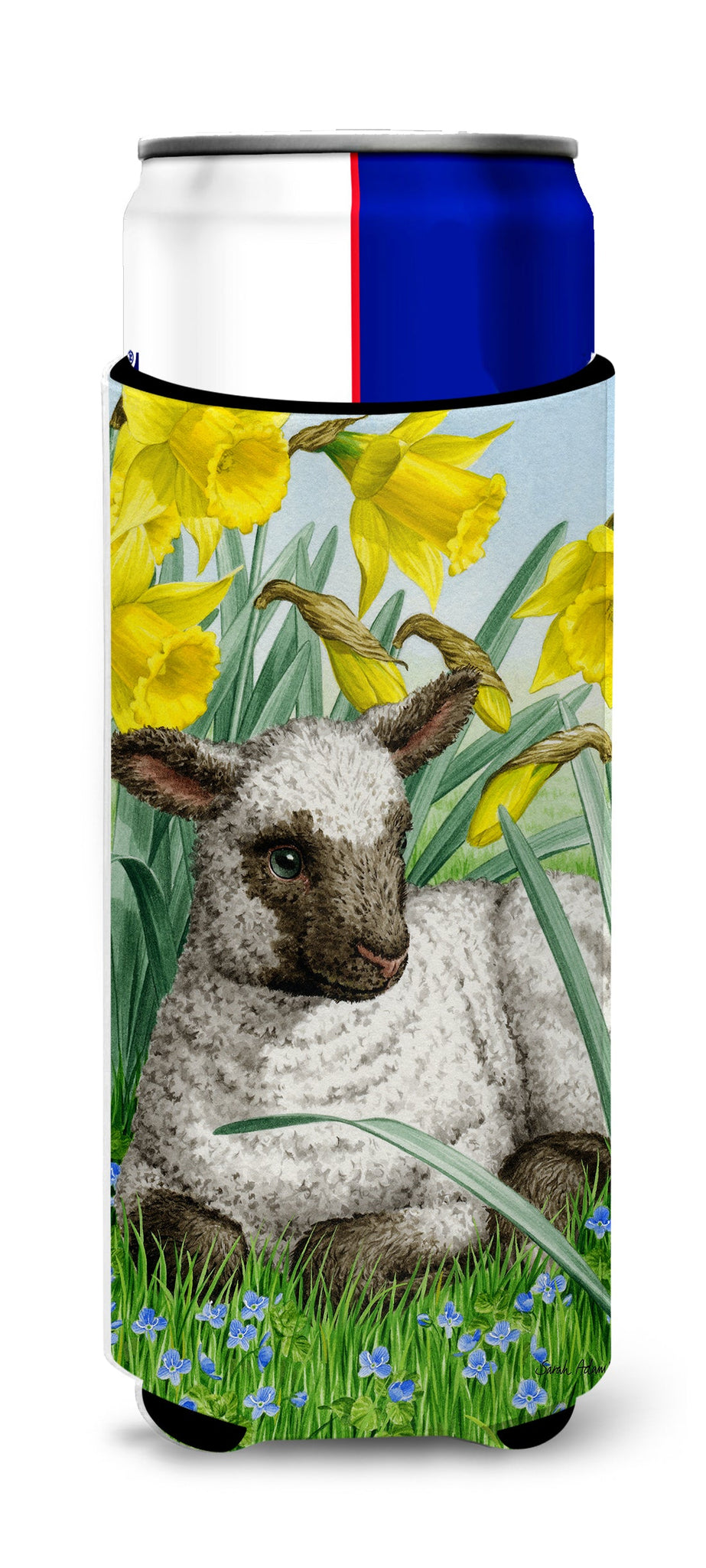 Decorate your space with our Lamb artwork on a Slim Can Hugger. Elevate your beverage experience with our Slim Can Huggers, uniquely designed to fit a variety of your favorite 12 oz slim cans. Perfectly suited for Michelob Ultra, Starbucks Refreshers, Heineken Light, Bud Lite Lime, Dry Soda, Coors, Resin, Vitaminwater Energy, and Perrier Cans, our huggers ensure your drink stays refreshingly cool. The feature that sets our can huggers apart is the striking full-color artwork, exclusively created by one of our talented artists. It adds a touch of individuality and style to your drink, making it easier to identify in a crowd. A unique blend of practicality and flair, these huggers are an absolute must-have at any gathering. Our can huggers are not just beautiful but also incredibly durable. The design won't fade or peel off, and they can be safely cleaned in a washing machine. These collapsible beverage insulators are easy to store and transport, making them perfect for all occasions. Enjoy your drinks in style and comfort with our exceptional Slim Can Huggers.
