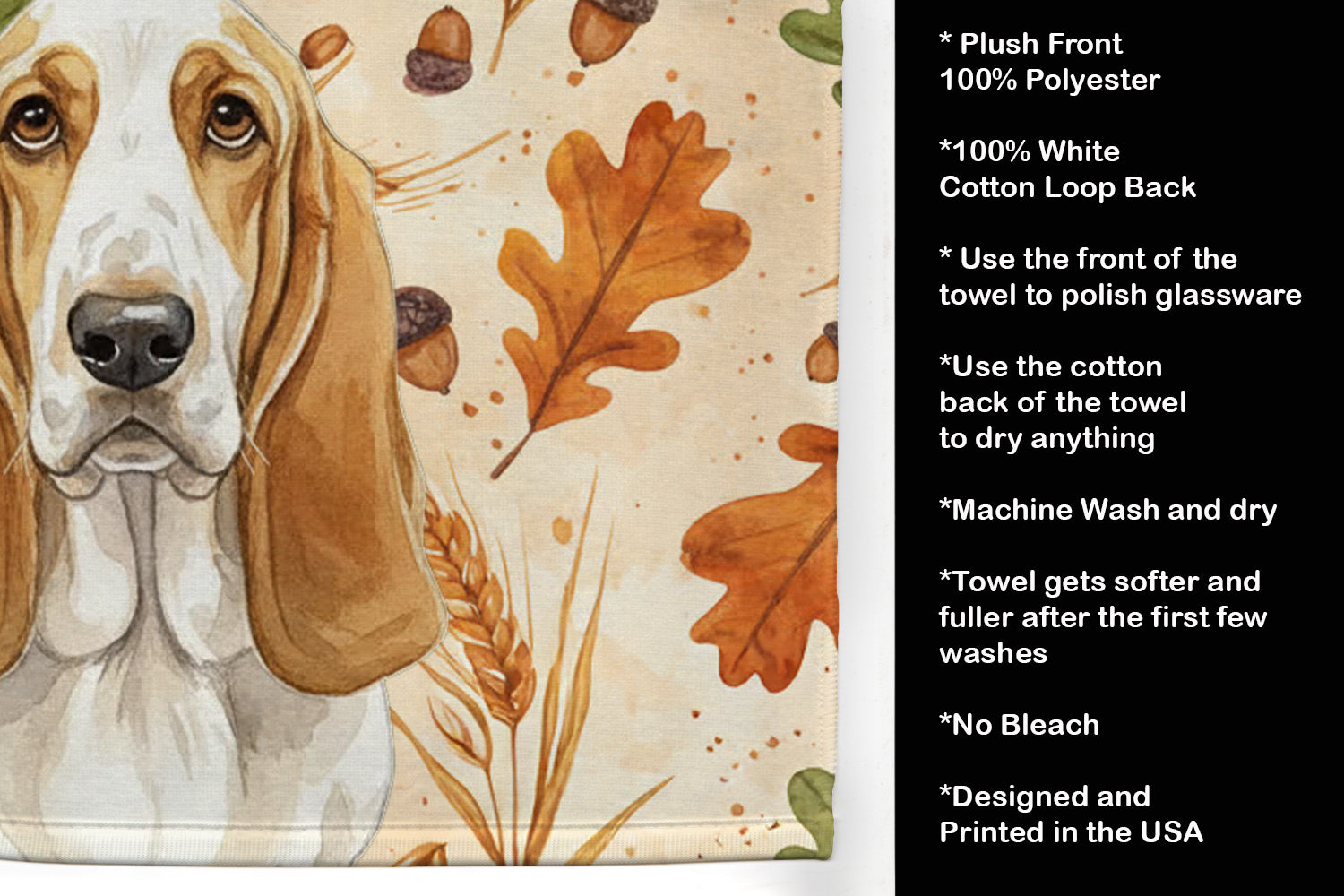 Kitchen Towel featuring breed specific Basset Hound artwork. Celebrate Thanksgiving with this Thanksgiving Kitchen Towel. Bring cozy fall charm to your sink or powder room with a plush velour towel featuring original watercolor artwork. The front is a soft, color-rich minky polyester that polishes glassware to a brilliant shine; the back is 100% white cotton terry loop for quick absorbency on hands, dishes, and counters. Artwork is dyed into the fibers for lasting color that won’t crack or peel. Finished edges keep the shape wash after wash. Size: 15" x 25". Machine wash; tumble dry low. Designed and printed in the USA.