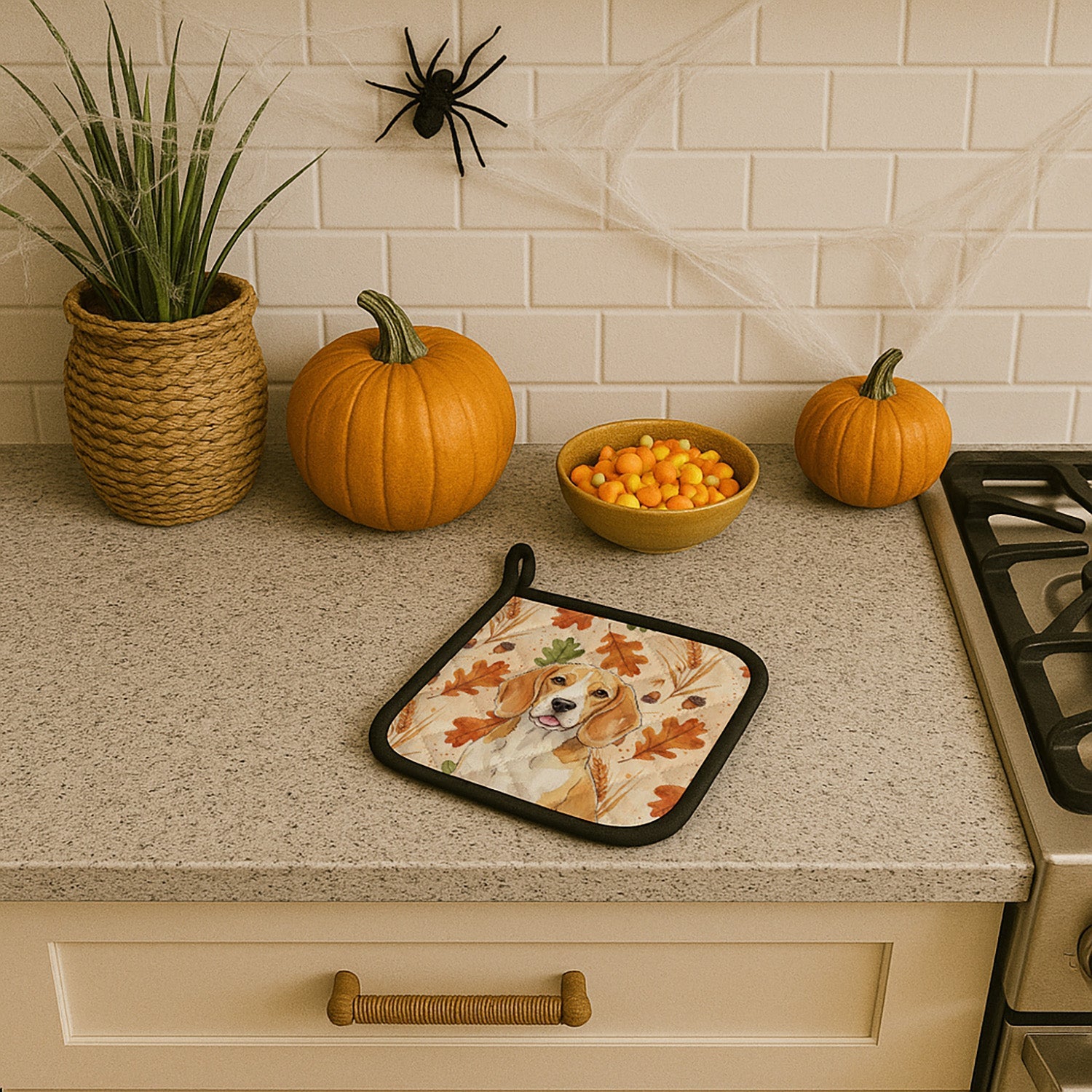 Pair of Pot Holders featuring breed specific Beagle artwork. Celebrate Thanksgiving with this Thanksgiving Pair of Pot Holders. Add warmth, personality, and function to your kitchen with our Heirloom Fall Pot Holder Pair. Each set includes two quilted hot pads, featuring original full-color watercolor artwork on a soft polyester front accented by black trim. Crafted with multiple layers for performance: Top Layer: Vibrant artwork permanently dyed into polyester fabric. Middle Layer: US-manufactured insulated material with breathable polyester fibers and a reflective metalized film that reflects heat back to its source. Bottom Layer: A silver heat-resistant backing for extra protection. Each pot holder measures 7.5" x 7.5", includes a hanging tab, and is quilted for durability. Use them to protect your hands, countertops, and tabletops — or as decorative trivets for Thanksgiving, Christmas, or everyday meals.