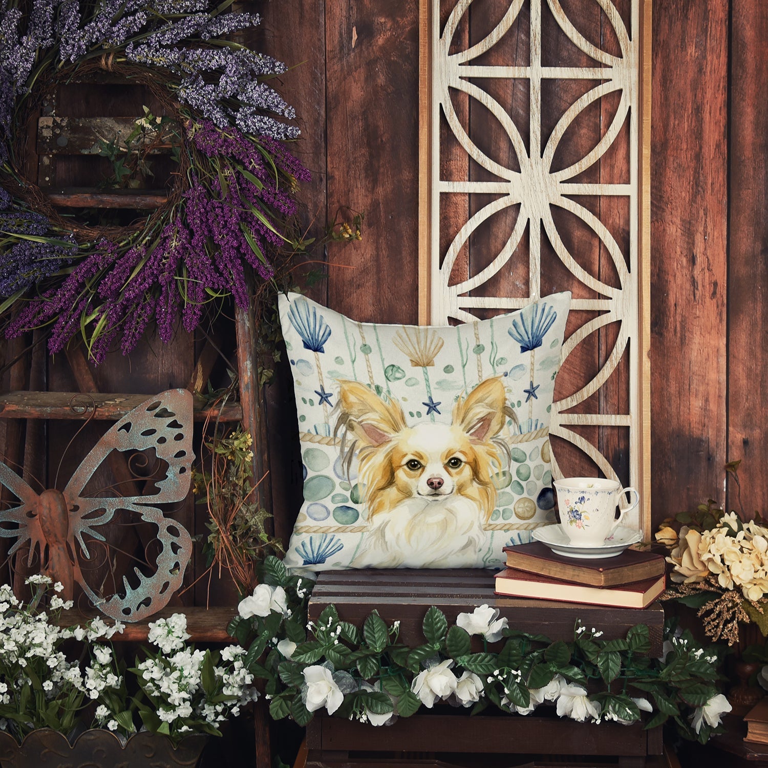 Throw Pillow featuring breed specific Papillon artwork. Revitalize your outdoor or indoor living space with Caroline's Treasures 18x18 Fabric Decorative Pillow. With a generously sized dimension of approximately 18 inches by 18 inches, this pillow makes a comfortable and aesthetic addition to any seating area. Made from a unique, water-resistant material developed by Caroline's Treasures, the pillow sham is 100% polyester fabric that's durable and ready to weather any condition. Its vibrant, full-color artwork will not fade over time as it is dyed with color-fast dyes. Whether you place it on your patio furniture, porch, veranda, or indoor couch, its soft canvas fabric ensures a cozy experience. The pillow is handcrafted in the United States, featuring a sham created from three pieces of fabric and a polyester insert for enduring shape and overstuffed comfort. Despite being robustly built to endure the outdoors, it is as soft and snug as your favorite indoor cushions. Please note, as all our pillows are handmade, sizes may vary slightly, adding to the charm of this unique decorative item.