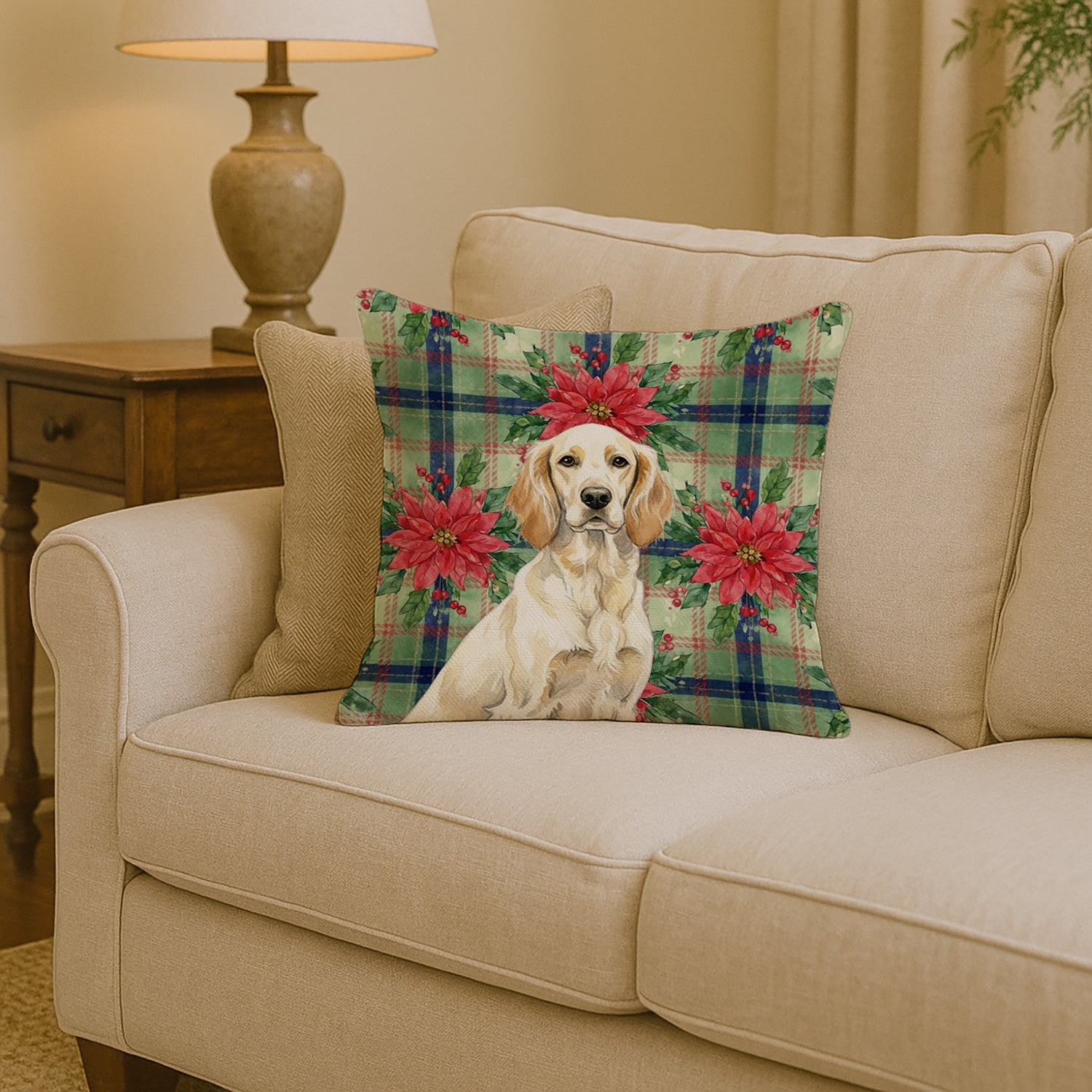 Throw Pillow featuring breed specific English Setter artwork. Celebrate Christmas with this Christmas Pillow. Add a touch of vibrancy and comfort to your outdoor seating with Caroline's Treasures Fabric Decorative Pillow. Measuring approximately 14 inches by 14 inches, this outdoor pillow is crafted to elevate the appeal of your patio furniture, infusing it with vivid color and artistic flair. The pillow includes a 100% Polyester Fabric sham filled with a quality pillow form to provide superior comfort. Innovatively made from our brand new material, specifically woven for its water resistance, this pillow is designed for durability. The soft canvas fabric offers versatility in use, fit for your indoor couch or your outdoor patio, porch, or veranda. The fabric is dyed with colorfast dyes built for resilience against weather conditions, ensuring the pillow retains its beauty over time. Constructed by sewing three fabric pieces to create a sham, the polyester insert is then nestled inside to form the pillow, resulting in an overstuffed pillow that maintains its shape. Both the sham and the pillow insert are proudly made in the United States. As the pillows are handcrafted, there may be minor variations in size, further enhancing their unique charm. Experience comfort in style with Caroline's Treasures Fabric Decorative Pillow.