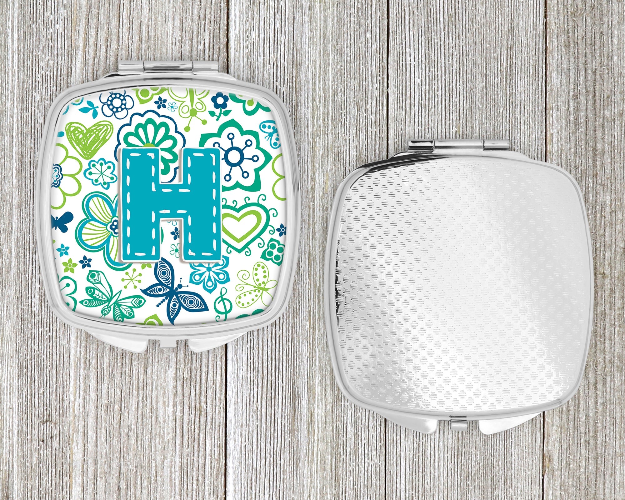 Letter H Flowers and Butterflies Teal Blue Compact Mirror – Stylish Purse Mirror with Artistic Covers CJ2006-HSCM