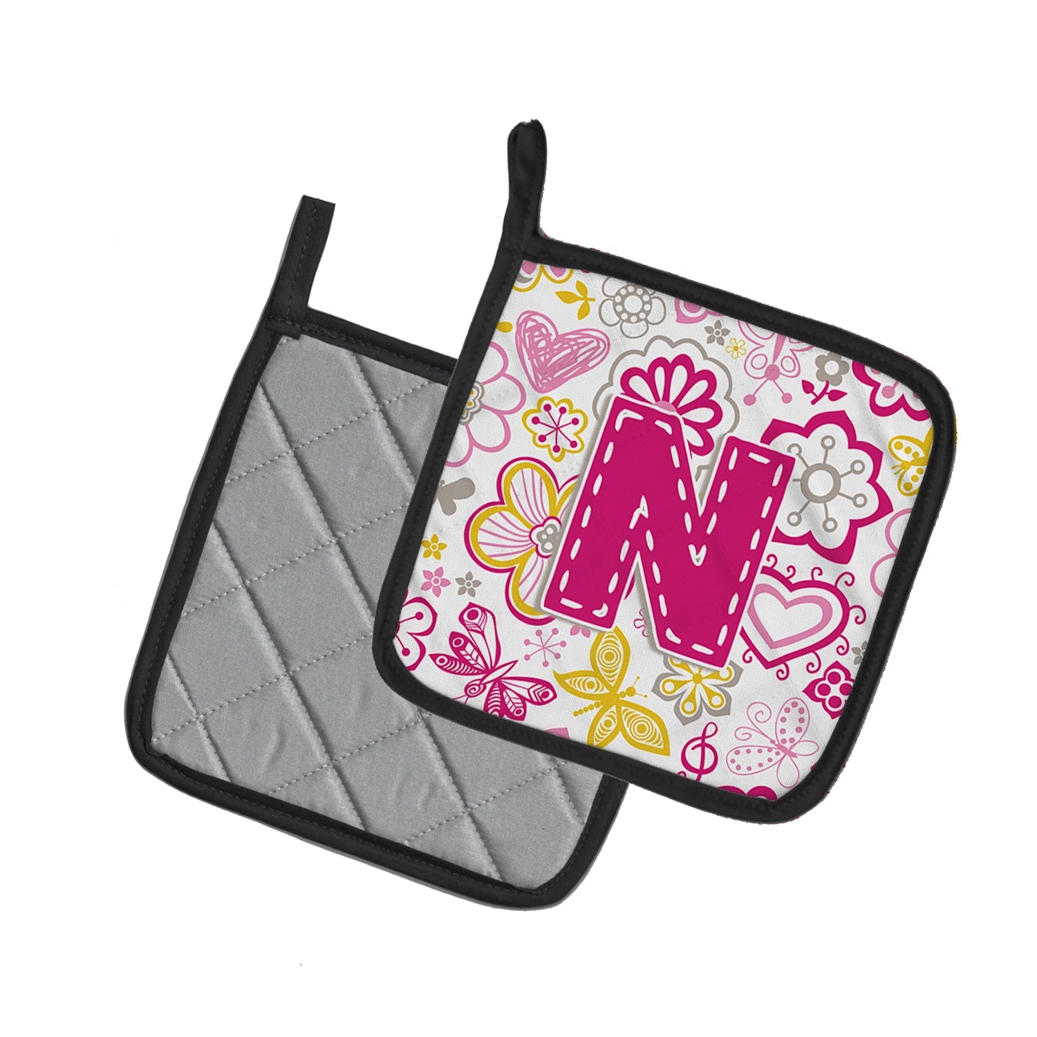 Letter N Flowers and Butterflies Pink Pot Holders - Set of 2 - Heat-Resistant Kitchen Essentials CJ2005-NPTHD