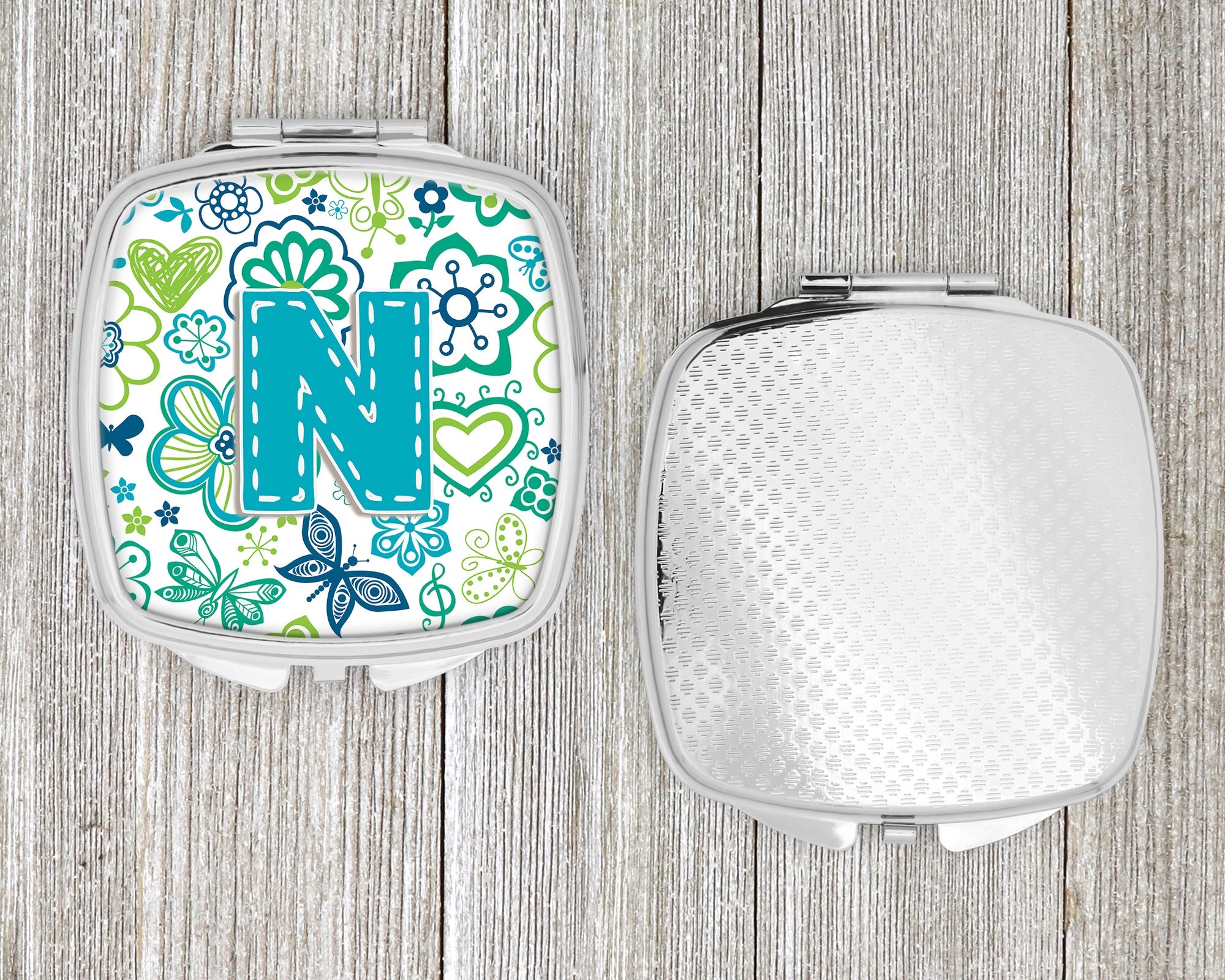Letter N Flowers and Butterflies Teal Blue Compact Mirror – Stylish Purse Mirror with Artistic Covers CJ2006-NSCM