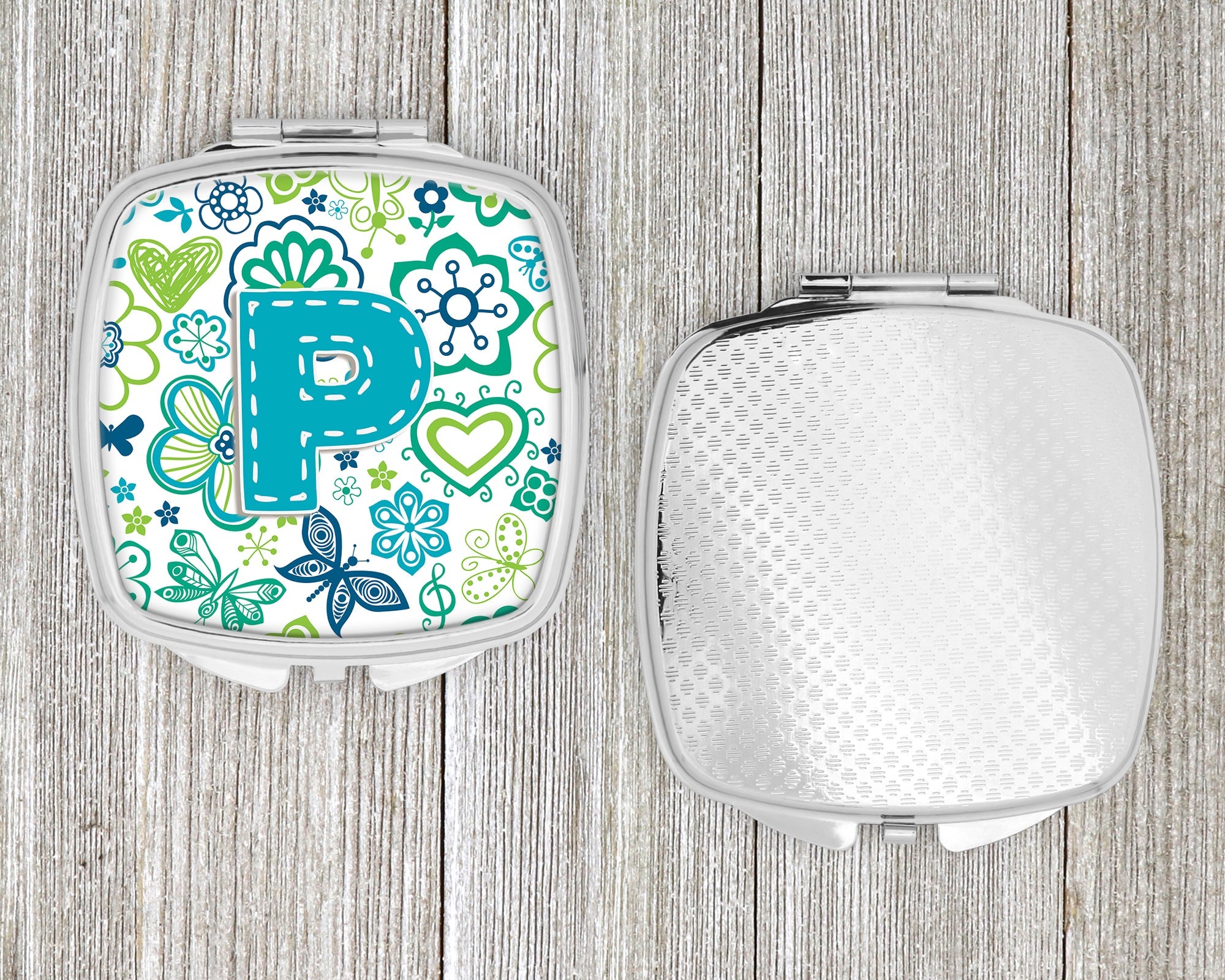 Letter P Flowers and Butterflies Teal Blue Compact Mirror – Stylish Purse Mirror with Artistic Covers CJ2006-PSCM